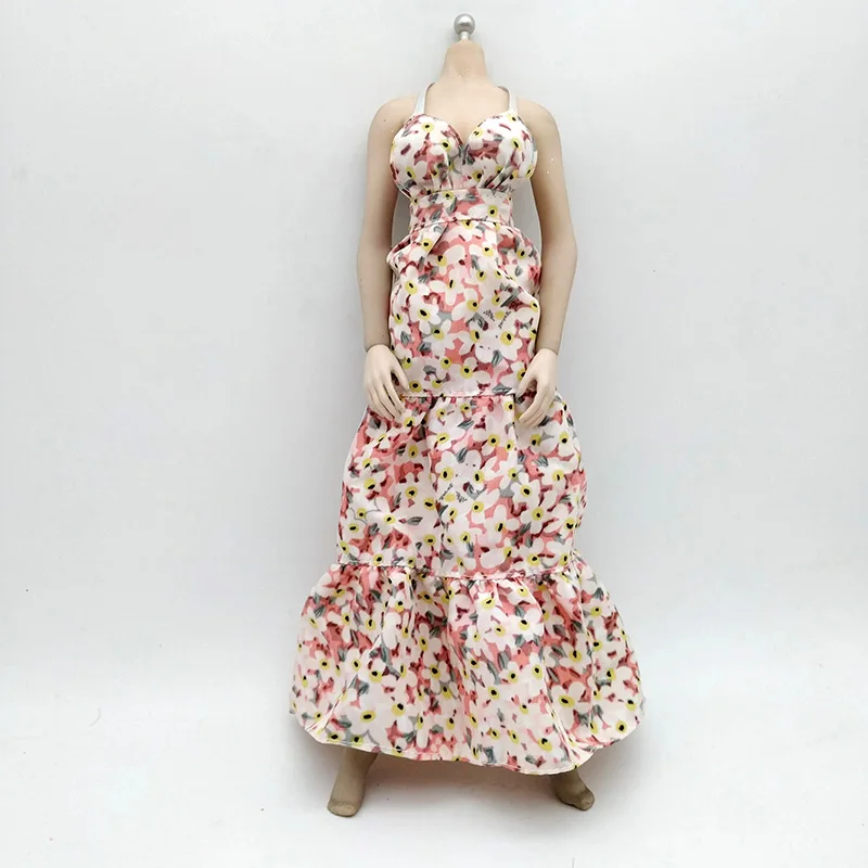 Immerse yourself in the charm of this beautifully crafted 1/6 scale backless floral long skirt dress, designed exclusively for 12-inch action figures with PH (Figure) bodies. The soft, lightweight flannel fabric flows seamlessly, showcasing a delicate floral pattern in shades of pink, white, and light brown, with darker accents that add depth. The fitted bodice with a sweetheart neckline highlights a feminine silhouette, while the backless design introduces an element of allure. The voluminous, tiered skirt features gathered ruffles near the hem, creating layered textures and gentle movement. Perfect for display or creative styling, this dress enhances your collection with elegance and romantic appeal, transforming your figure into a stunning visual centerpiece.