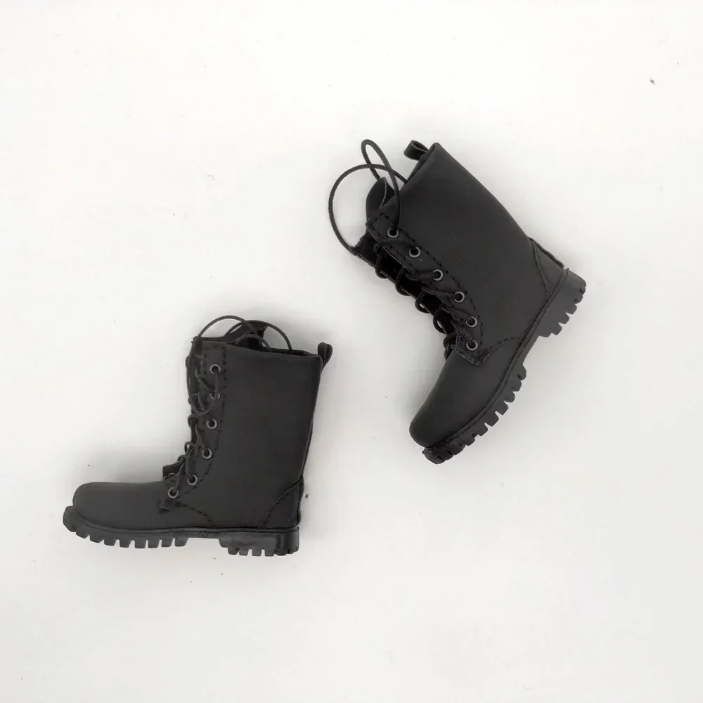 The Male Soldier Black Combat Boots are meticulously designed for 1/6 scale male soldier dolls, crafted from solid matte PVC material for enhanced durability and realism. They feature a rounded toe, slightly elevated heel, and a functional lacing system with visible grommet holes for a secure fit. Extending just above the ankle, these boots offer a robust silhouette, complemented by detailed tread patterns on the soles to emphasize a rugged aesthetic. Additionally, a small pull tab at the back ensures easy wear. Specifically tailored for dolls with detachable feet, these boots perfectly align with military action figure themes.