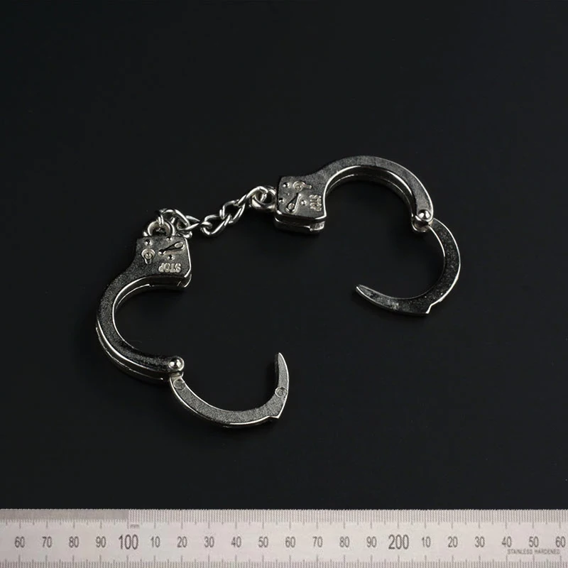 These meticulously crafted 1/6 scale soldier handcuffs are made from a shiny metal alloy with a striking silver finish, tailored for 12″ action figures. Designed specifically for robber and criminal doll scenes, these handcuffs feature a circular cuff for one wrist and an open cuff for the other, connected by a short, authentic chain. Each cuff is adorned with a detailed locking mechanism and includes a unique inscription or branding that adds to its realistic look. The handcuffs not only enhance action figure displays but also stand out beautifully against a dark background, making them ideal for collectors seeking high-quality themed accessories.