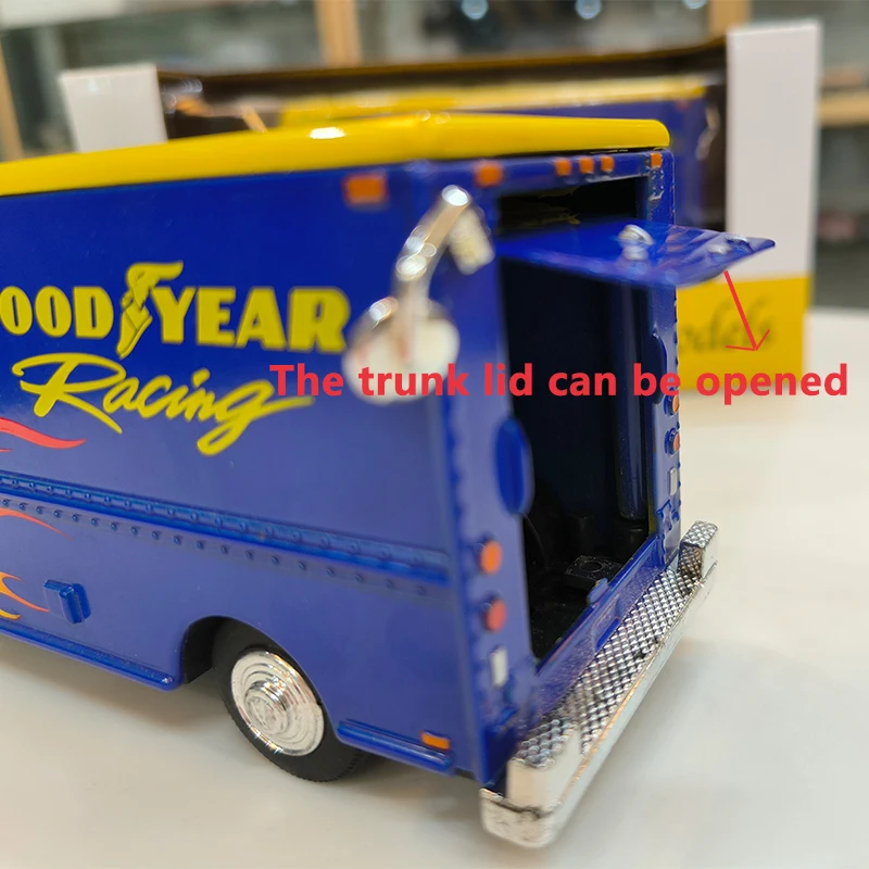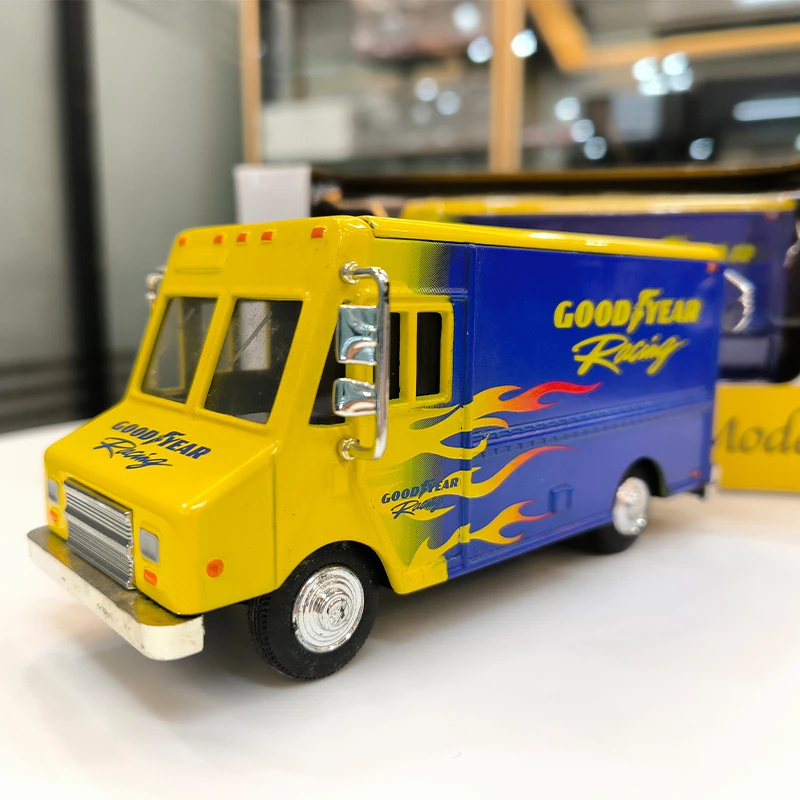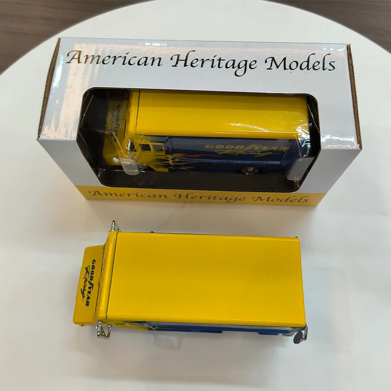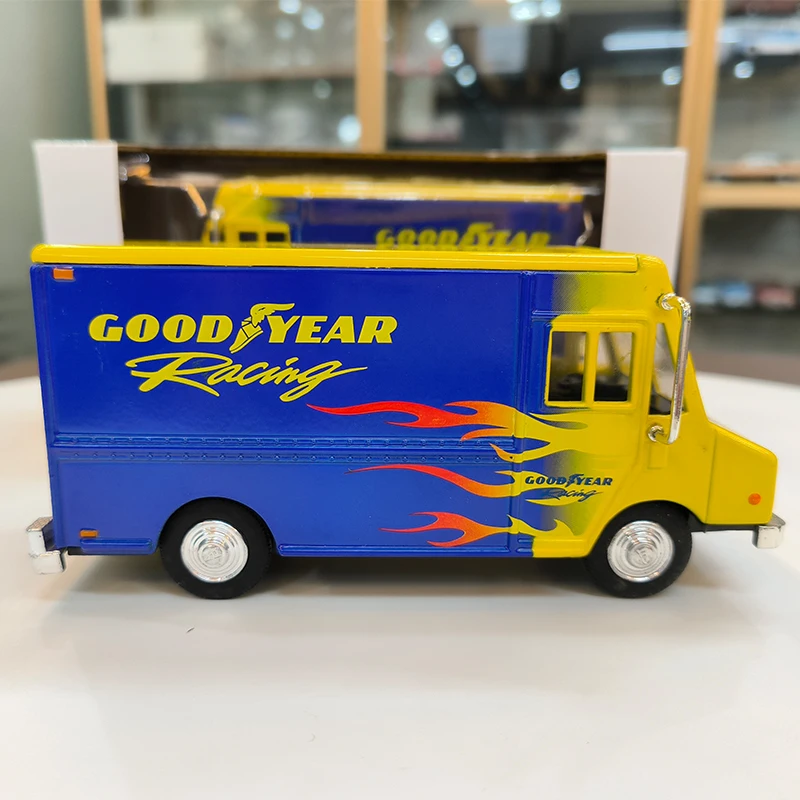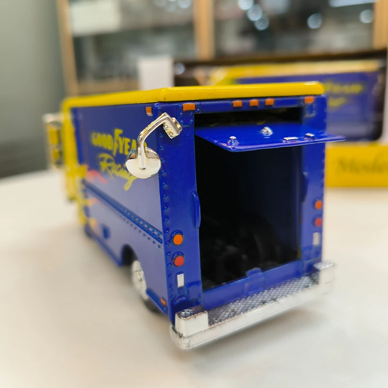 This highly detailed 1/64 scale American storage truck model features a vibrant blue body with yellow accents on the cab, complemented by bold orange and red flame graphics and the “GOODYEAR Racing” logo, creating a dynamic and energetic appearance. Made from alloy with environmentally friendly ABS plastic components, it measures 14x11x6 cm and weighs 0.3 kg. The model showcases realistic features such as chrome mirrors, headlights, and silver rims with plastic tires, all scaled accurately for a striking display. Perfect for collectors, gifts, or decorative purposes, this diecast non-electric model is packaged in its original box and designed for adult enthusiasts aged 18 and above.