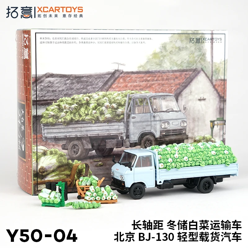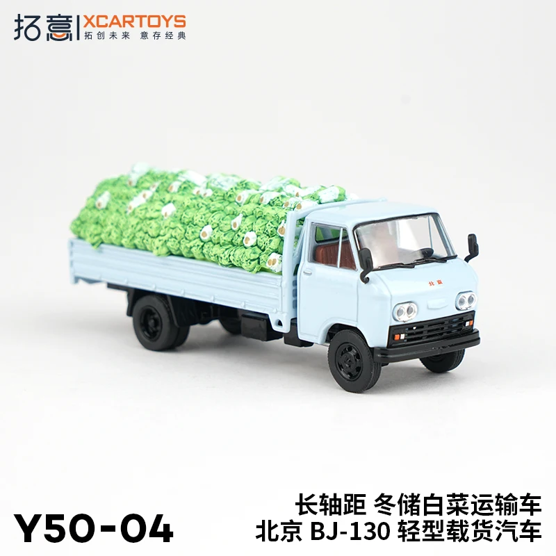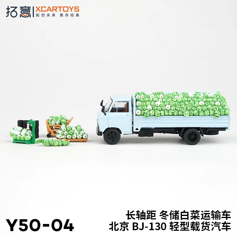 Immerse yourself in the detailed realism of this Xcartoys 1/64 CA30 Liberation Truck model, designed for collectors and enthusiasts who appreciate authentic miniature scenes. Crafted entirely from diecast metal, this miniature captures the rugged charm of an army-inspired vehicle with a sleek, subdued color palette featuring a pale blue or light grey cab and matching flatbed. The model's fine details include clear, realistic windows revealing interior elements, dark side mirrors, and contrasting black headlights and grille, emphasizing its authentic military utility. Loaded with miniature green lettuce heads, some with pink and white accents, the truck portrays a vibrant agricultural scene. Accessories like a miniature shopping cart, a green scale, and a black container enhance its realism, making it an ideal display piece or imaginative toy.
