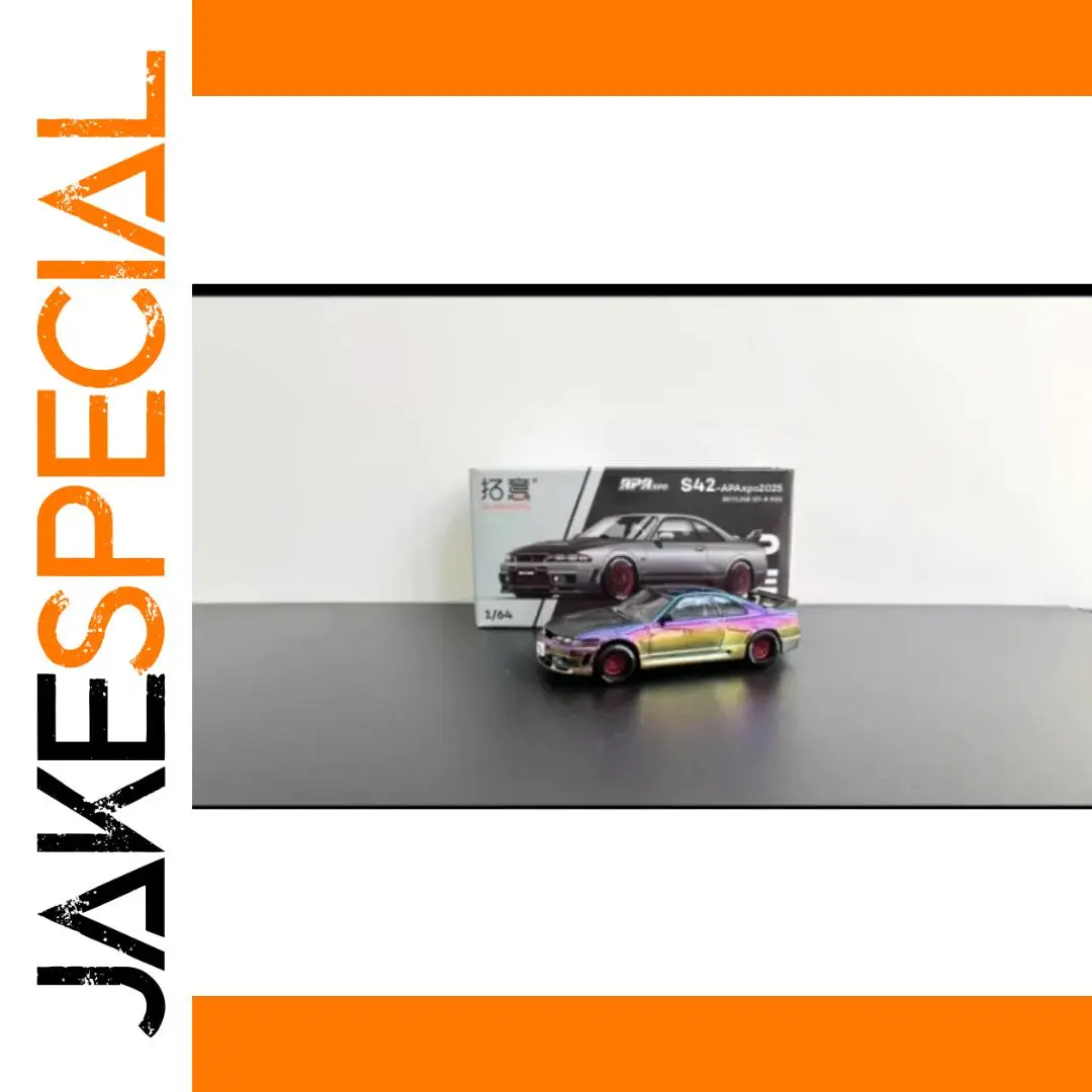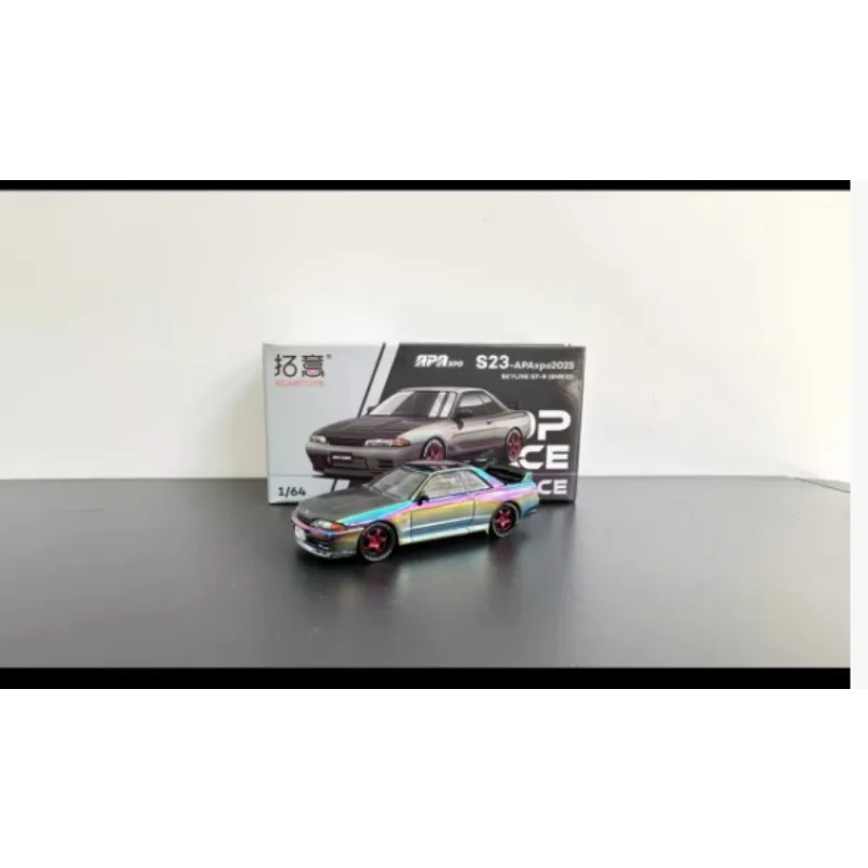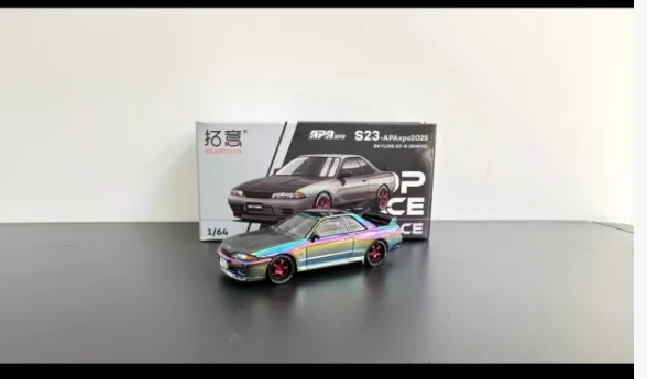 Step into the world of high-performance racing with this exquisite 1/64 scale die-cast alloy model, featuring the iconic R32, R33, and RX37 vehicles. Crafted with meticulous attention to detail, this model showcases a sleek, aerodynamic silhouette, accentuated by smooth, flowing curves and a low, sporty profile. Its iridescent finish shifts dynamically between vibrant purple, blue, and gold hues, depending on the viewing angle, giving it a captivating shimmer. The finely molded panel lines, contours, and realistic features such as headlights, grille, taillights, and exhaust details truly embody the essence of a race-ready vehicle. Perfect for collectors and enthusiasts, this compact yet striking model elevates any display with its eye-catching aesthetic and craftsmanship.