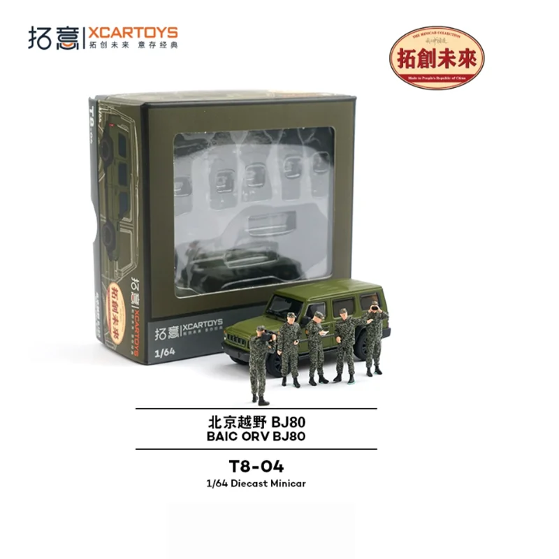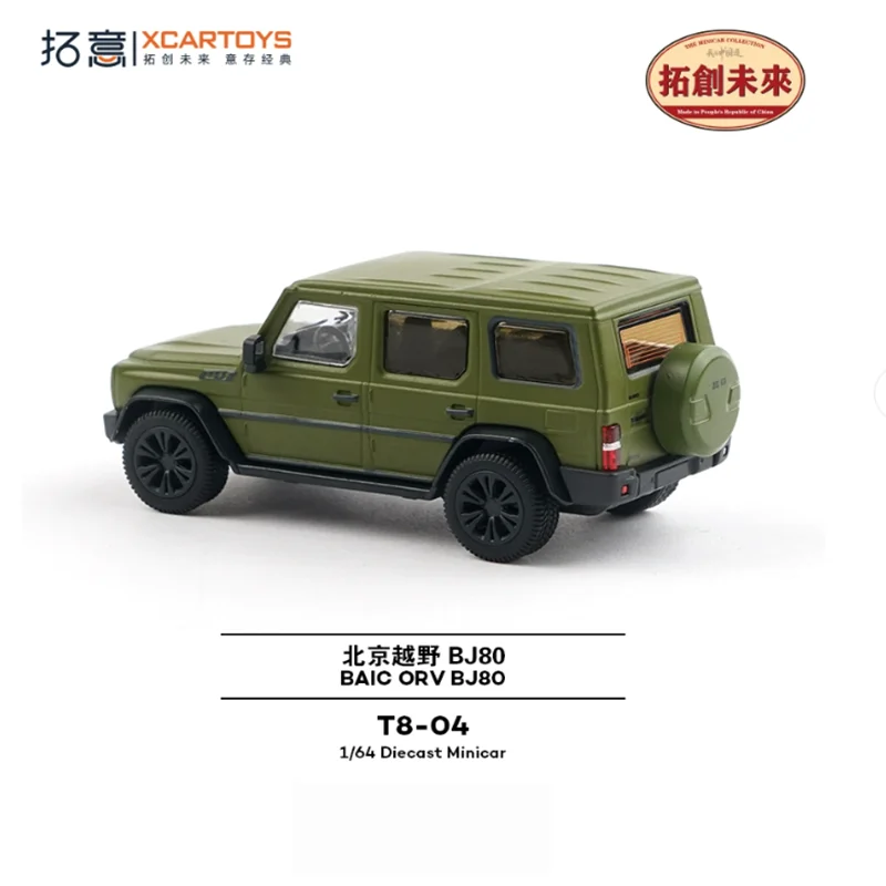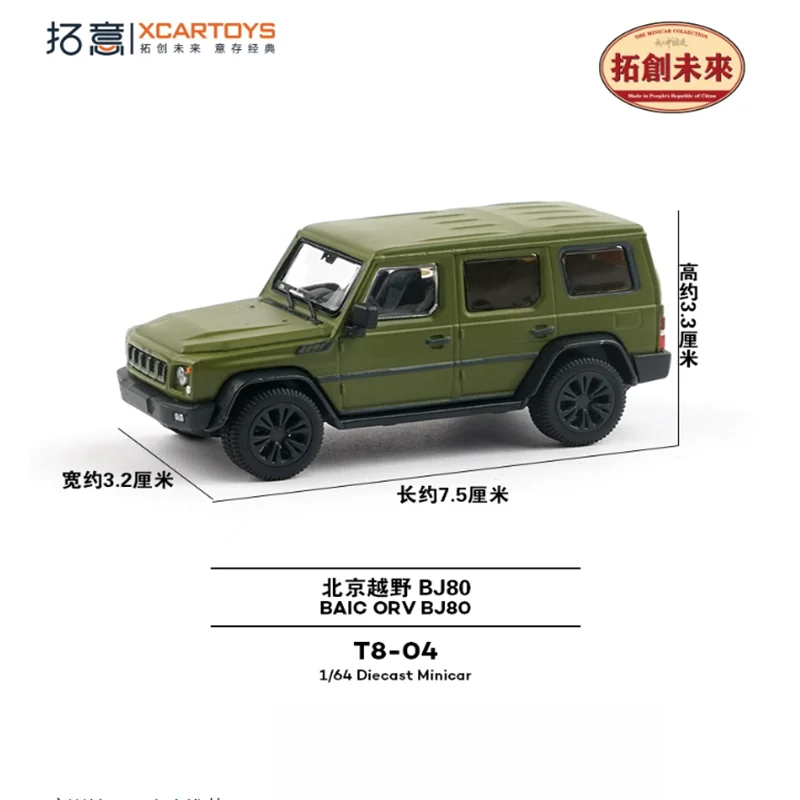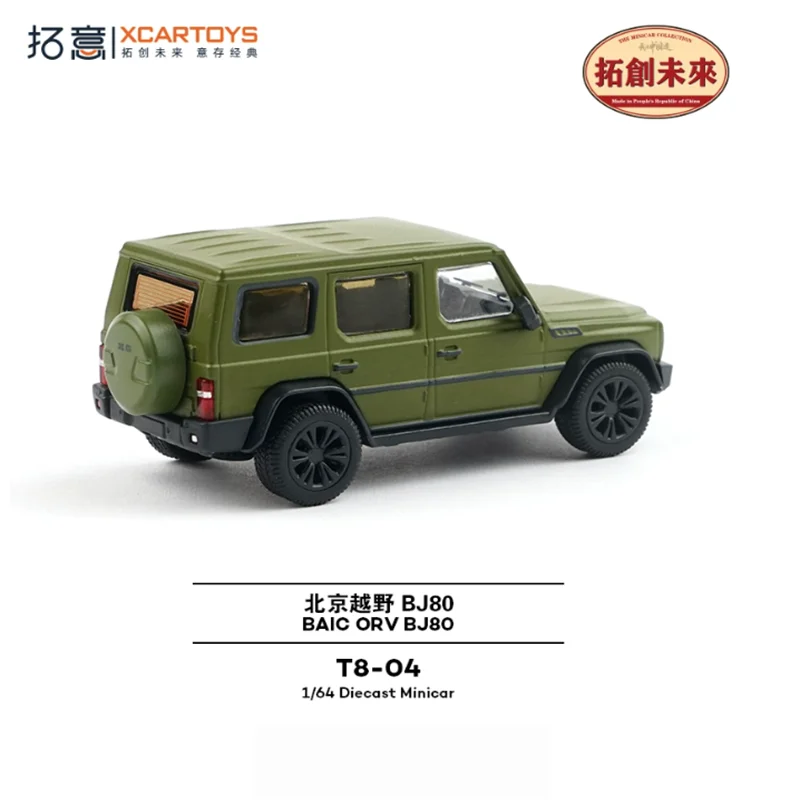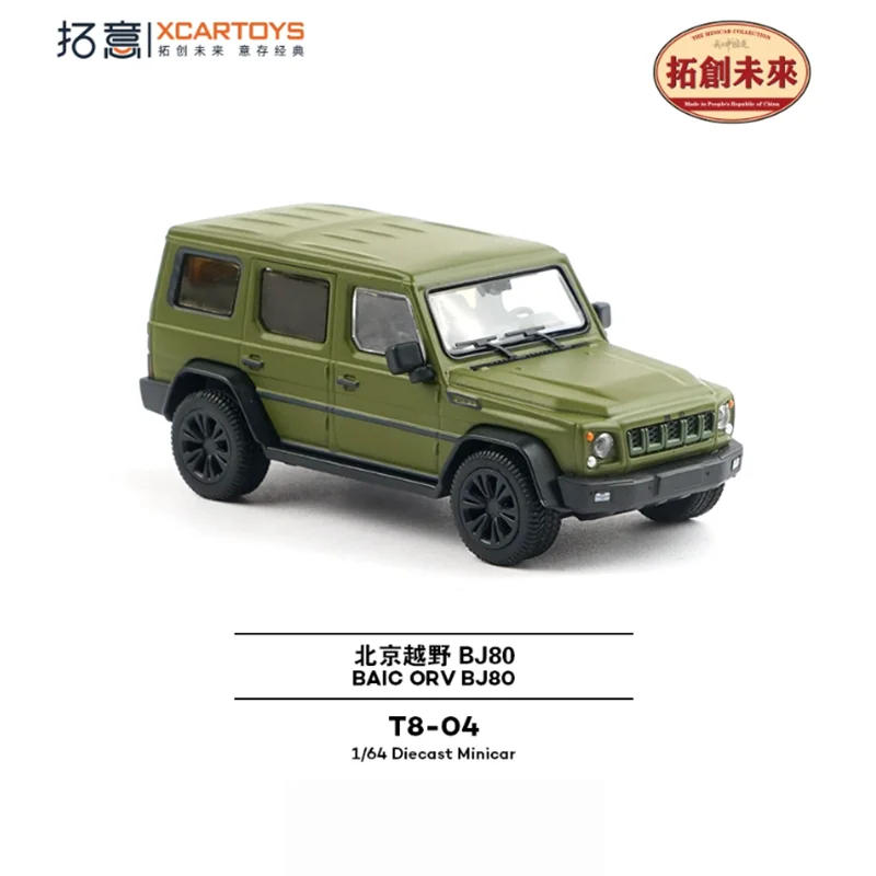 This 1:64 scale diecast alloy model of the BAIC ORV BJ80 captures its rugged, military-inspired design with a matte olive green finish, boxy silhouette, and practical details like a broad hood, squared front end, and textured off-road tires. Black accents on the bumper, wheel arches, and wheels contrast strikingly with the body, while dark tinted side windows enhance its utilitarian aesthetic. Crafted from durable metal without electrical components or batteries, this detailed replica is perfect for display or collection, appealing to adult enthusiasts who appreciate realistic military-style vehicles. Its sturdy construction and meticulous design make it an impressive addition to any collection.