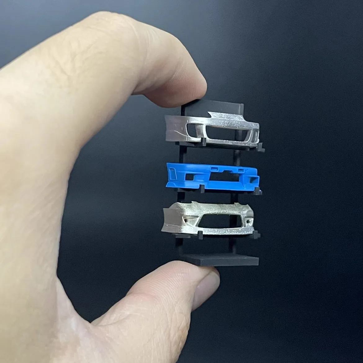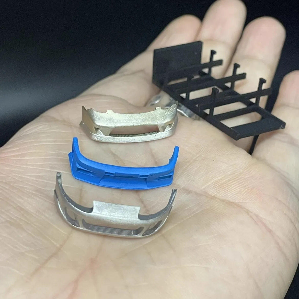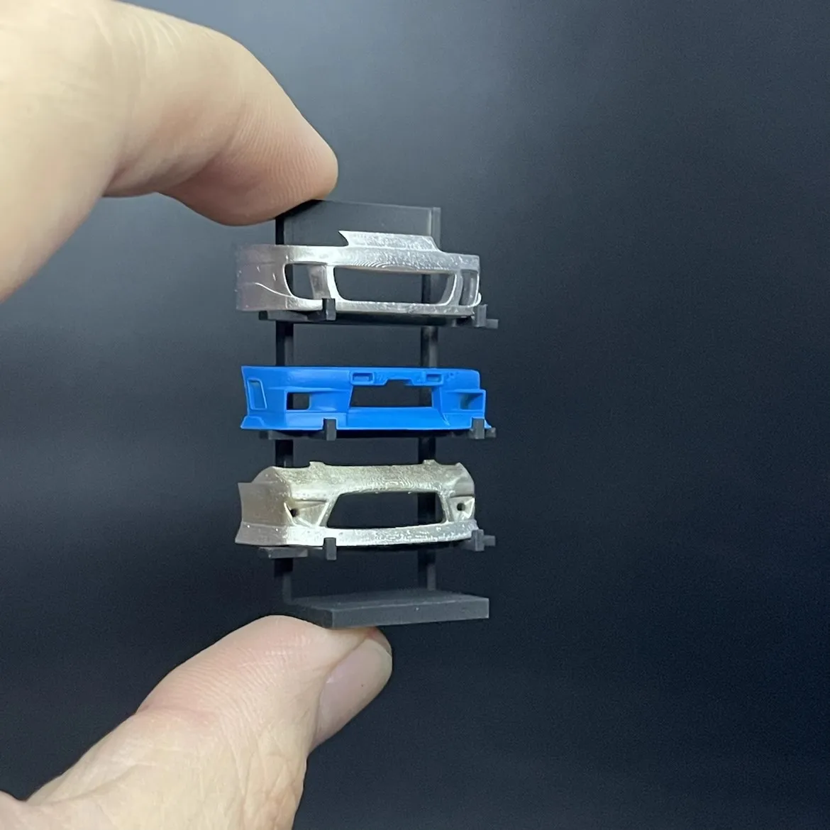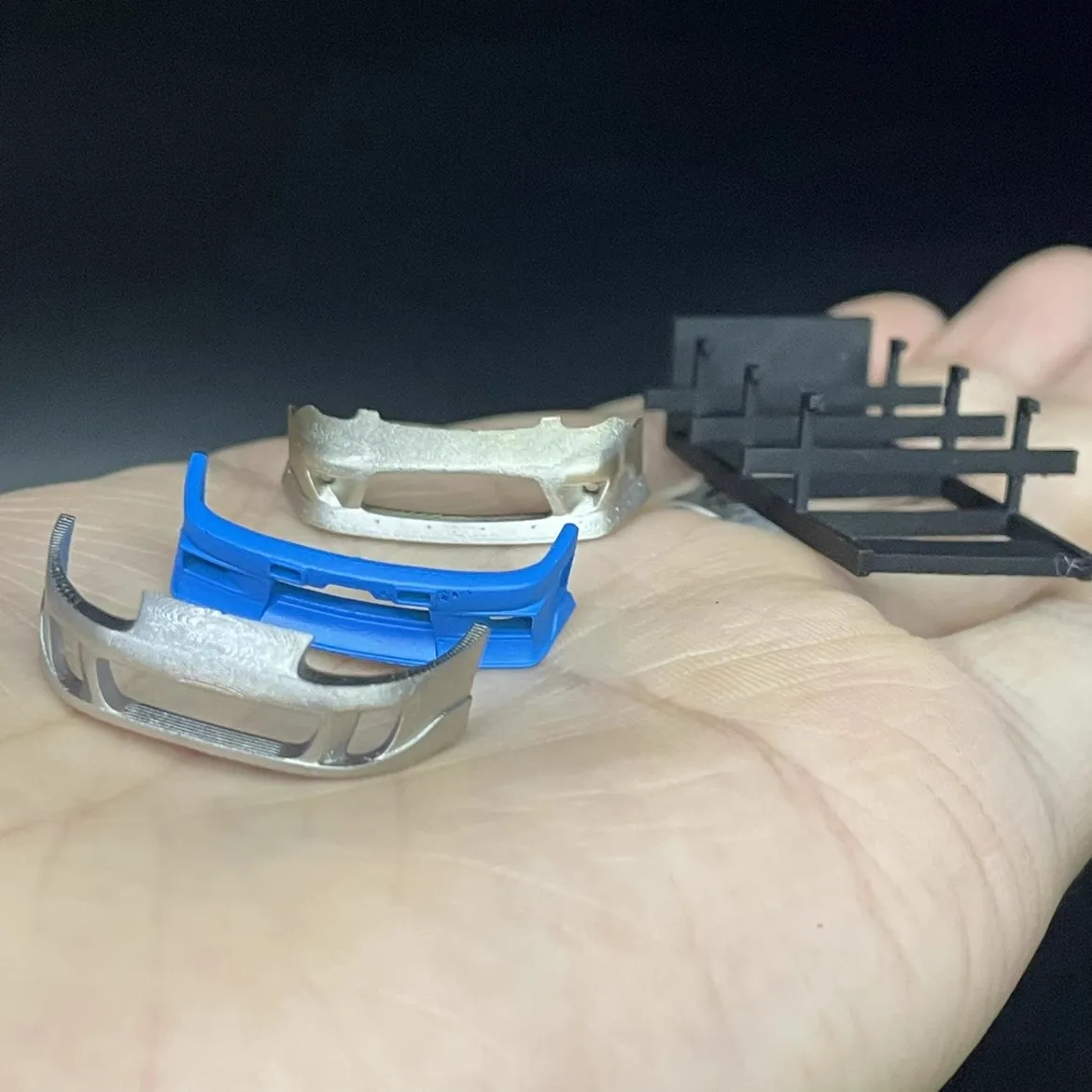 The 1/64 scale car model front bumper display stand is an exquisite addition to your miniature garage scene. Featuring three meticulously designed bumpers, this stand enhances the visual appeal of your model cars. The top layer boasts a shiny metallic silver bumper, perfectly sculpted for realism. A vibrant blue resin bumper sits in the middle, showcasing intricate detailing, while the bottom features a subdued silver bumper. All layers rest on a sleek black base, providing stability and contrast. This display is perfect for collectors, offering a stylish way to showcase your prized models and create captivating dioramas.