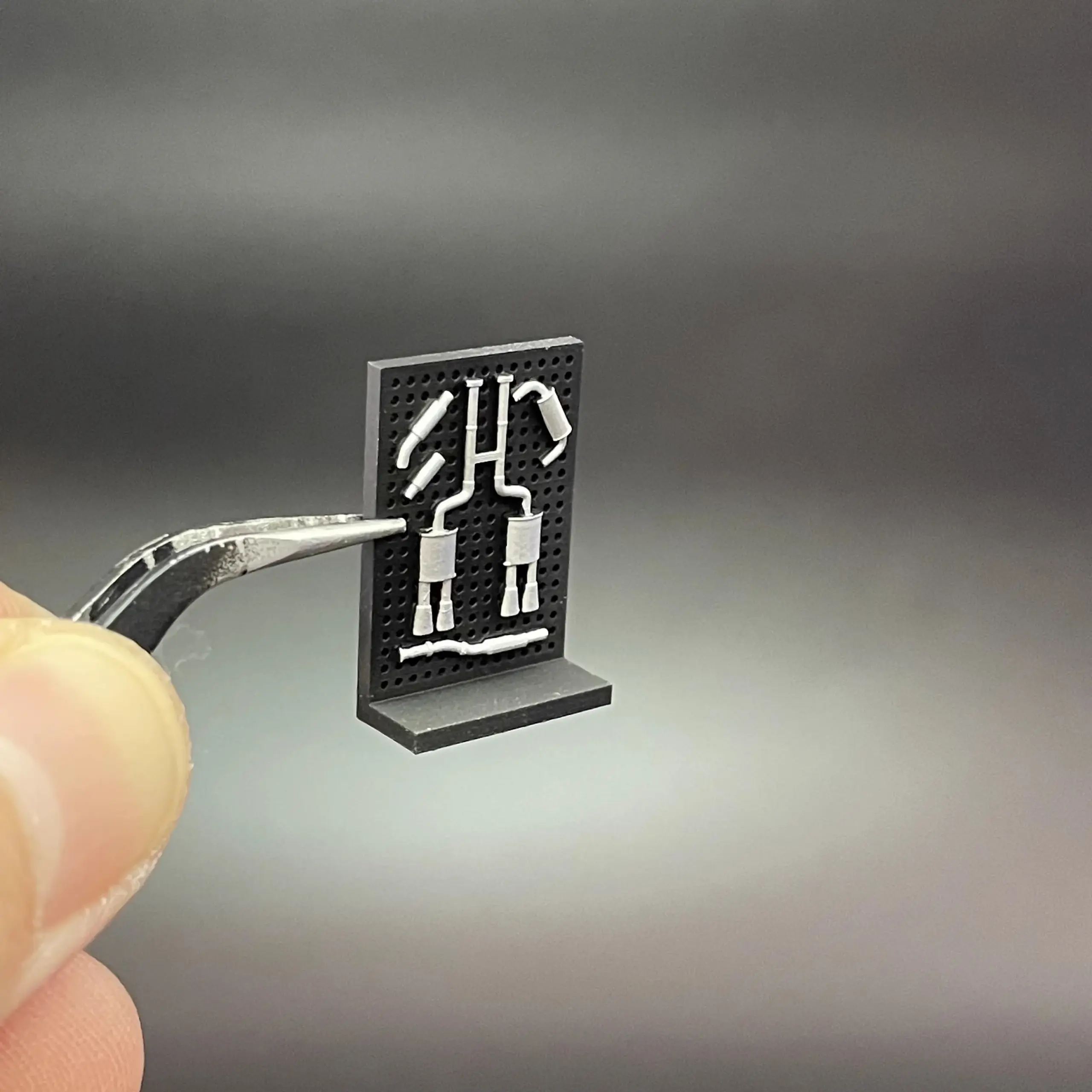 Elevate your miniature automotive scenes with this exquisite Custom Modification 1/64 Exhaust Display Stand. Crafted with precision, this model features finely finished resin exhaust parts that exhibit a brilliant polished silver appearance. Set on a textured black base, each component showcases intricate bends and curves typical of real exhaust systems. This versatile display stand is perfect for DIY projects, model enthusiasts, and collectors alike, inviting creativity in car decoration and miniature photography. Imagine showcasing your latest project on this stunning piece, adding an element of sophistication to your display.