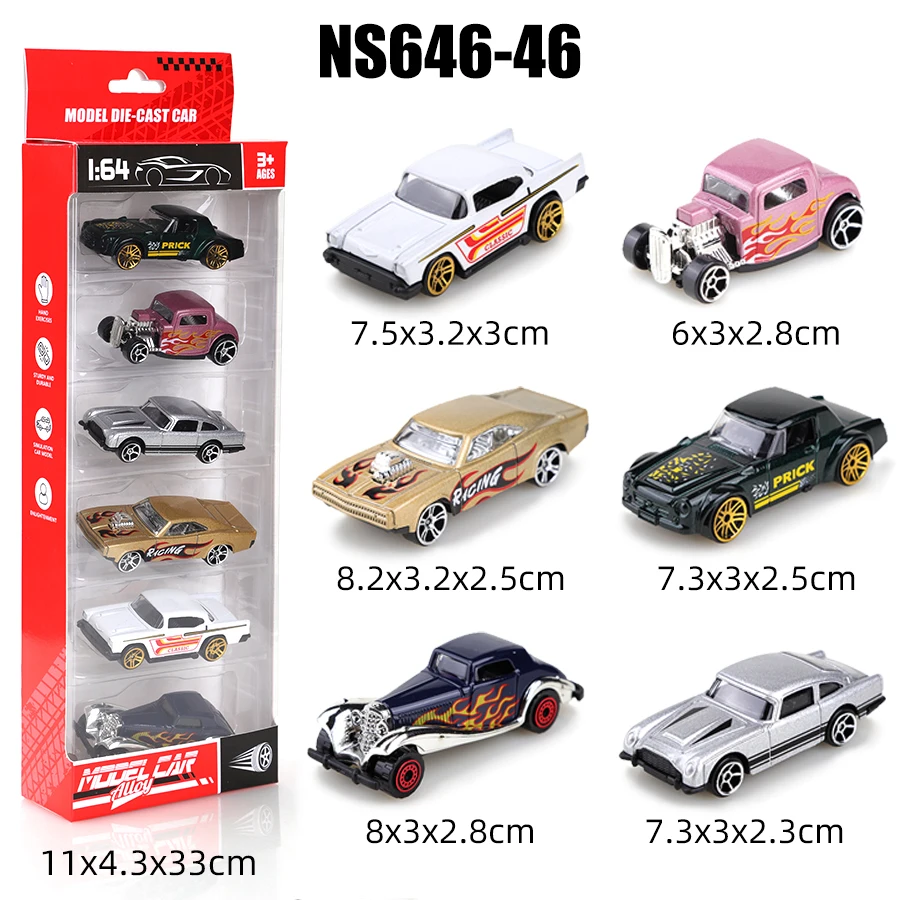 Elevate your collection with this 1/64 scale die-cast metal set of six miniature cars, each meticulously crafted with vibrant, glossy finishes and detailed designs. Featuring a sleek black model with yellow accents, a classic white muscle car, a fiery pink hot rod with orange and yellow flames, a radiant gold vintage-inspired sportscar, and additional colorful ornaments, this set offers a dynamic mix of styles. With dimensions and finishes that highlight speed and retro charm, these collectible ornaments are perfect for display or gifting. Made from high-quality metal without hazardous chemicals, they are ideal for enhancing any car enthusiast’s or family’s decorative collection.