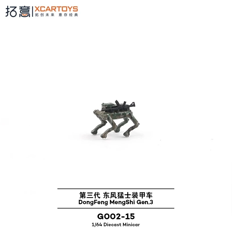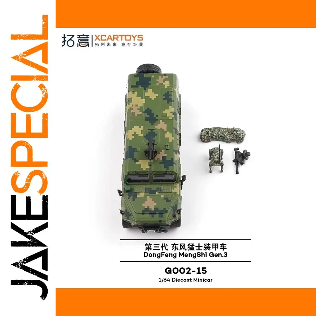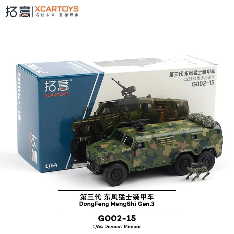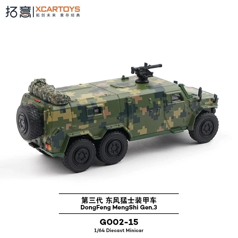 Immerse yourself in military realism with this 1:64 scale diecast replica of a third-generation Dongfeng Mengshi armored vehicle. Crafted from durable metal alloy, this rugged model showcases a sharp, boxy design with detailed camouflage in shades of green, tan, dark green, and black (color code G002-15). Its textured surface mimics armored plating, with black panels accentuating the windshield and hatches. Complete with accessories like camouflage covers, miniature chairs, and firearm models, it offers an authentic, visually striking appearance. Designed for collectors aged 14 and older, this non-electric, highly detailed model perfectly captures the power and resilience of military off-road vehicles in a compact, collectible size.