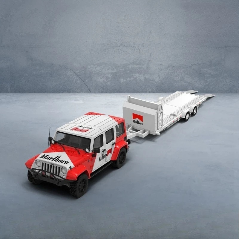 - Detailed branding with “HKS” on the black model and “Marlboro” logos on the white model, along with realistic grille, headlights, side mirrors, and roof rack for authentic appearance.