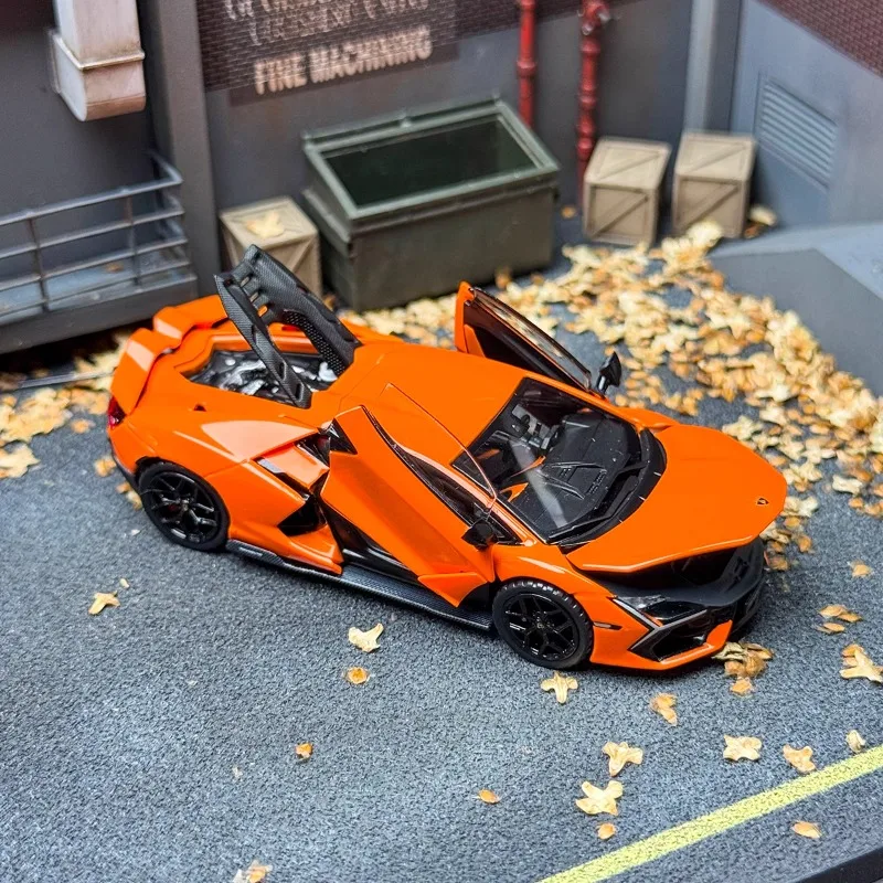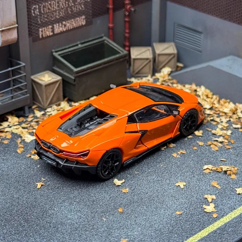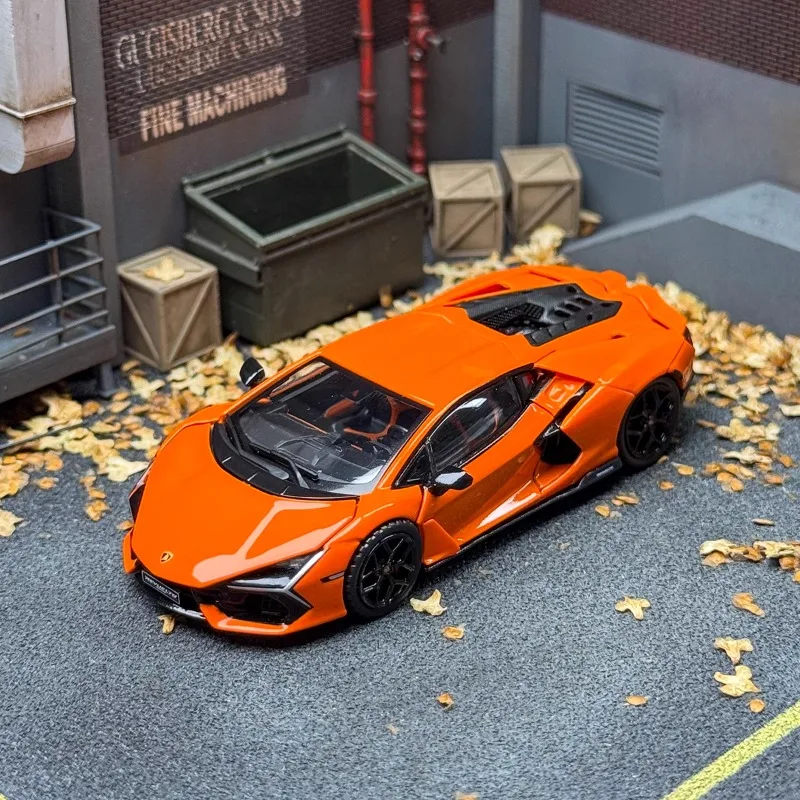 The HH Diecast 1/64 Scale Lamborghini Revuelto Racing Car Model is an exquisite representation of luxury automotive design, predominantly painted in a striking orange color. This model captures every detail of the Lamborghini Revuelto, showcasing its sleek, aerodynamic lines and sporty aesthetic. The well-crafted butterfly doors open to reveal a meticulously designed interior, equipped with a stylish dashboard and comfortable seating. Constructed from diecast metal, alloy, and plastic, this model offers durability and realism. It is a perfect collectible for any enthusiast, combining both visual appeal and intricate detail in a compact scale of 1/64.