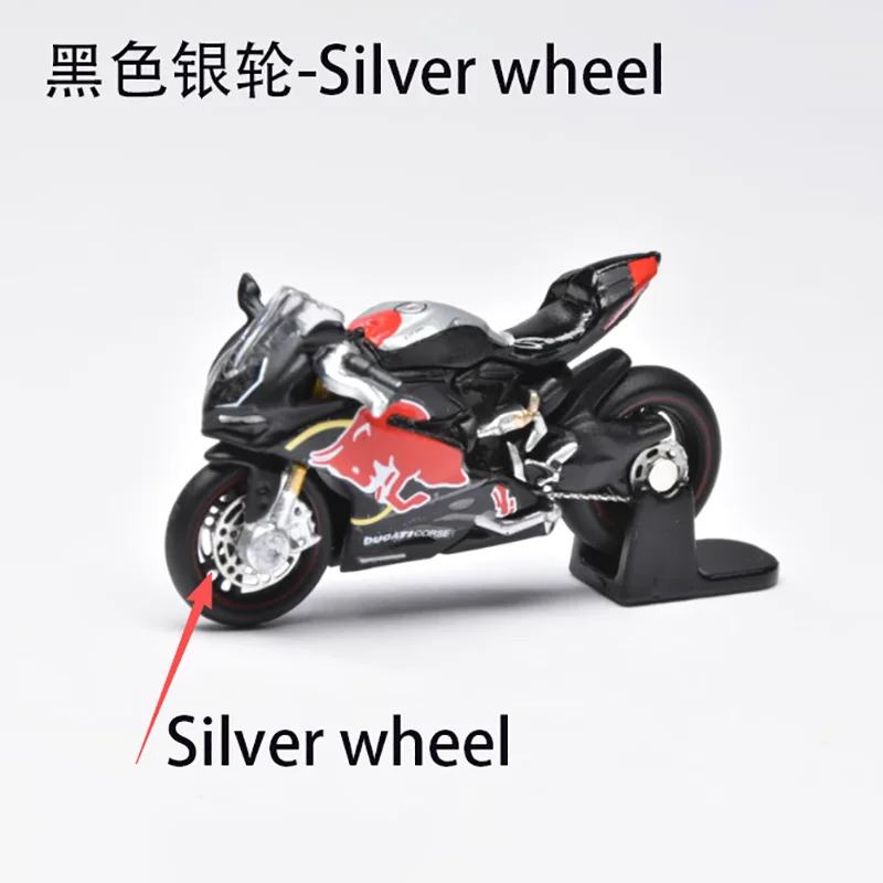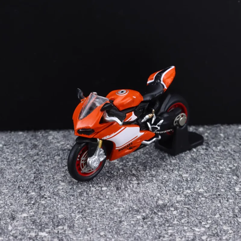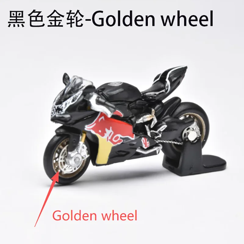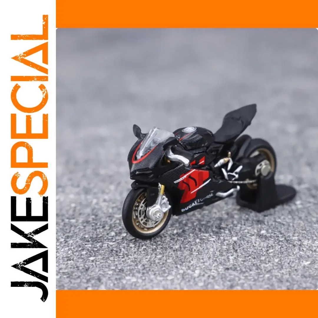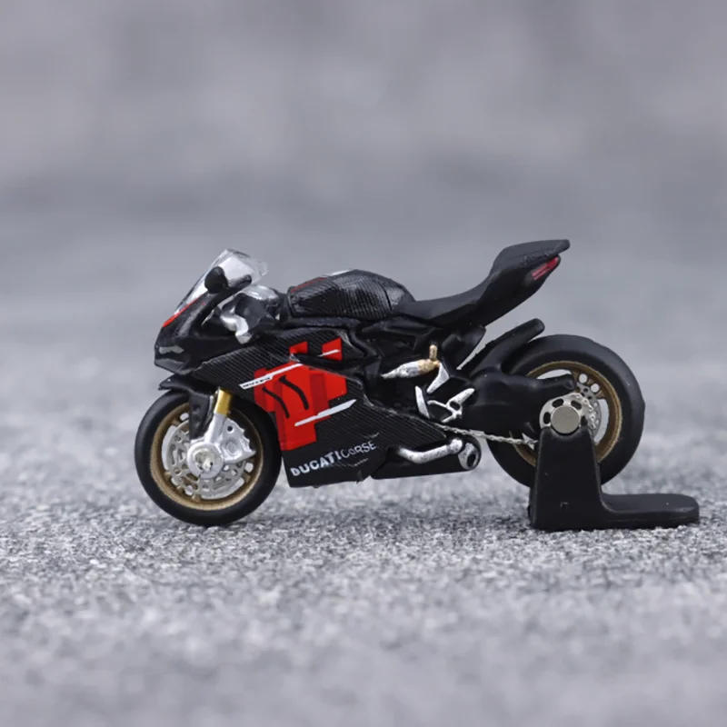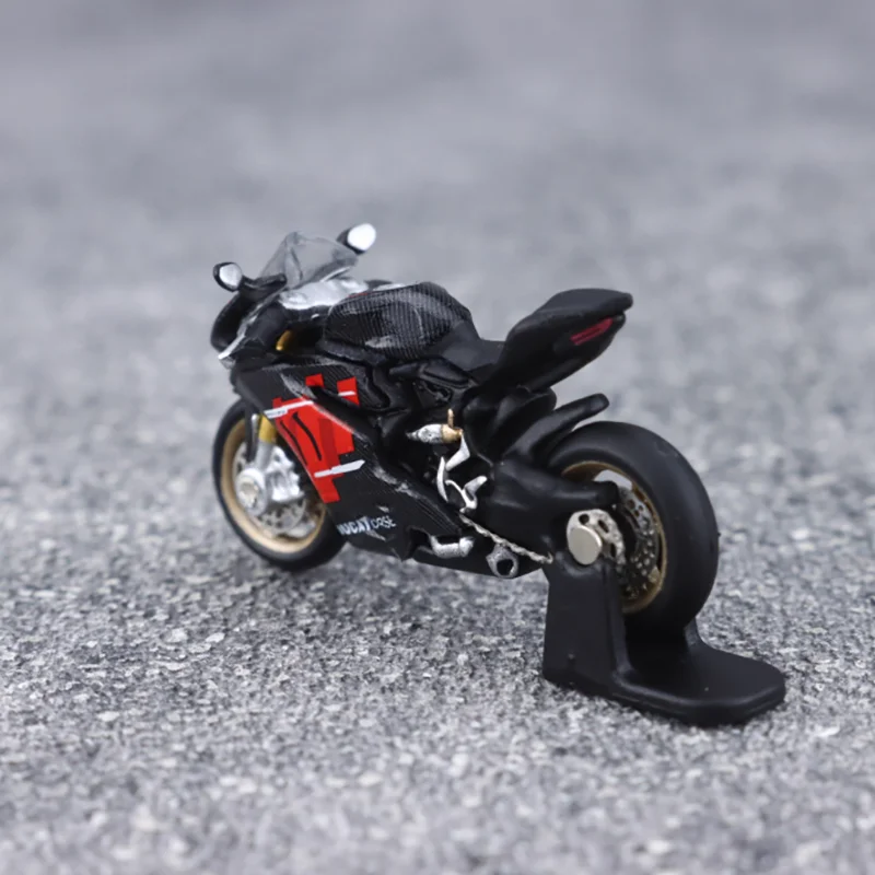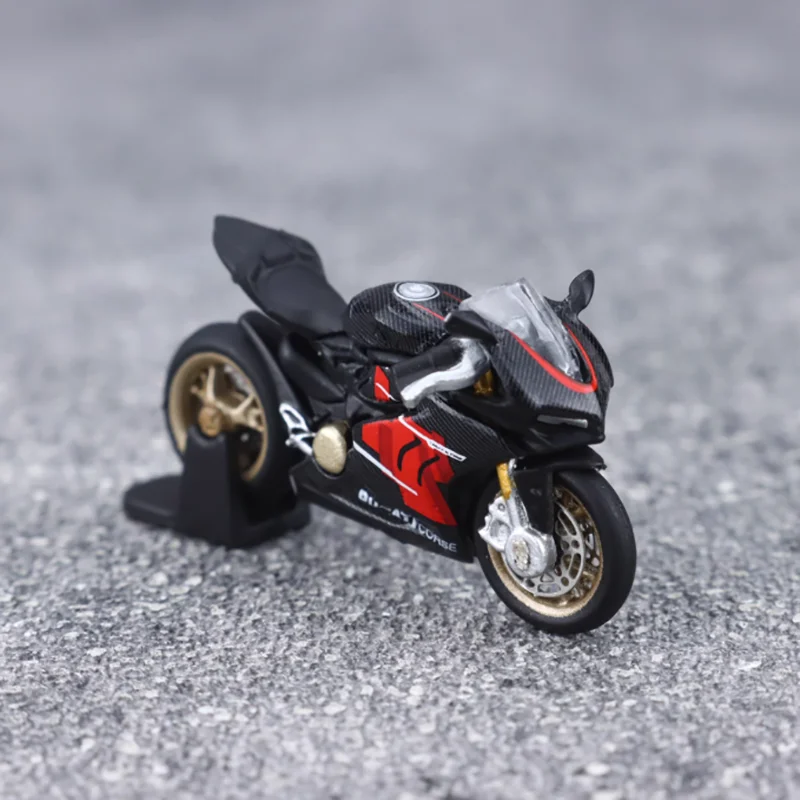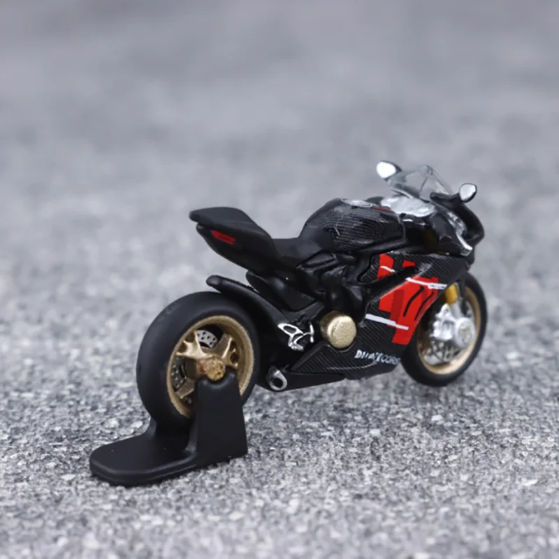 Bring home this highly detailed 1/64 scale diecast motorcycle model that captures the sleek essence of high-performance sport bikes. Measuring approximately 3 by 1 by 2 centimeters, this miniature replica is crafted from alloy and plastic, offering exceptional craftsmanship and realism. Its smooth black body, highlighted with vibrant red accents on the fairings, exudes a sporty and aerodynamic aesthetic that enthusiasts will admire. The model's fine details, including a realistic windshield, gold-colored brake discs, engine cover, exhaust pipe, and chain drive, provide a lifelike appearance. Designed purely for display, this collectible adds a dynamic touch to your collection or makes a perfect gift for motorcycle lovers and model enthusiasts alike.