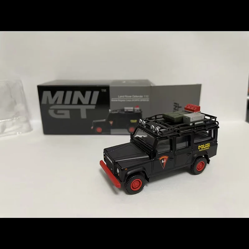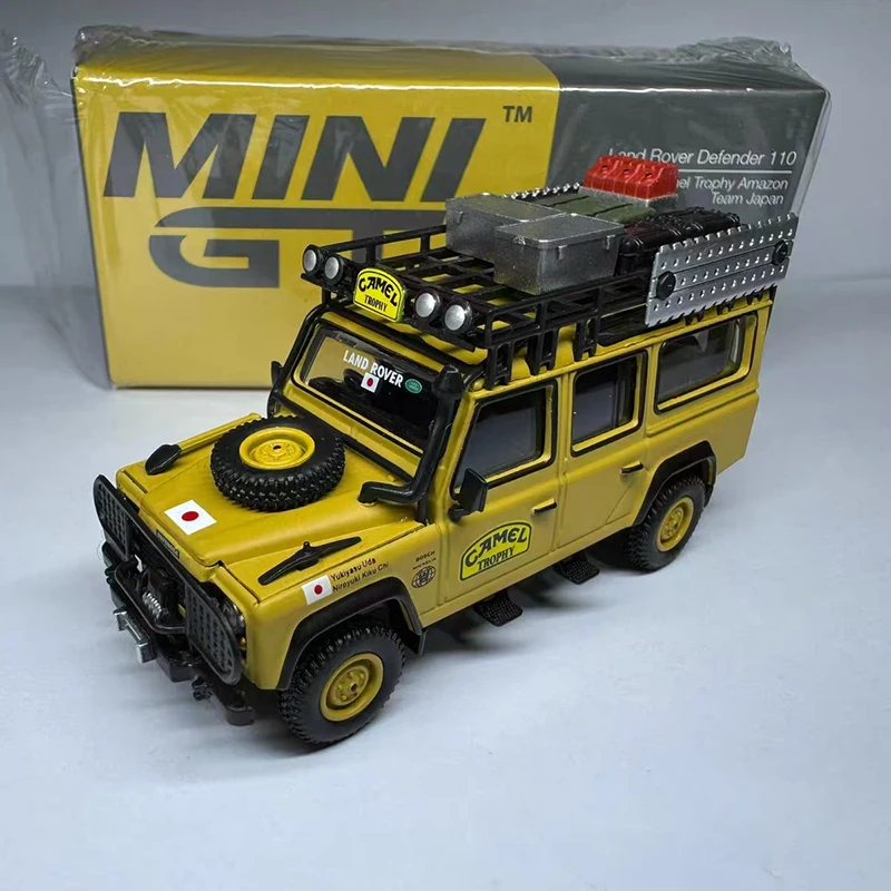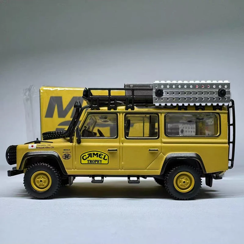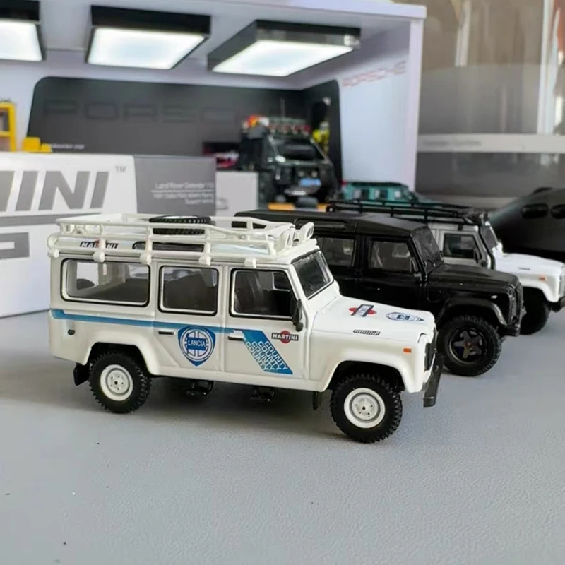 Discover the exquisite 1/64 scale diecast model of the Land Rover Defender 110 Camel Cup car, perfect for collectors and enthusiasts alike. This stunning model features vibrant designs, including a green vehicle with a white stripe, a sleek white version with blue accents, a rugged yellow variant with bold accents, and a striking black police model. Each piece is crafted from durable metal and plastic materials, showcasing intricate details such as textured grilles and functional roof racks. This versatile model serves as an ideal gift, home or car decoration, and a collectible treasure.