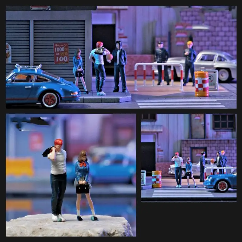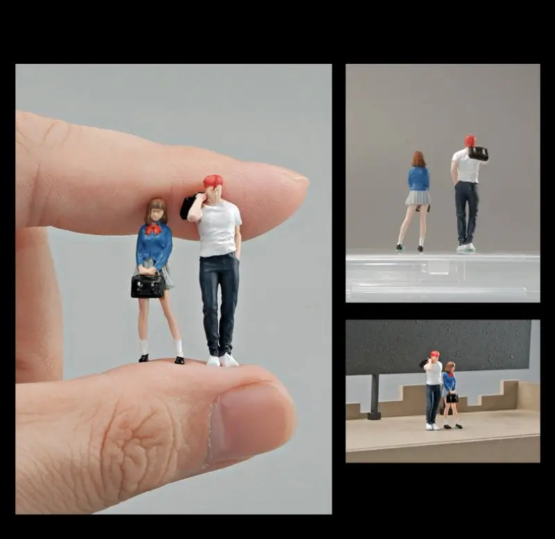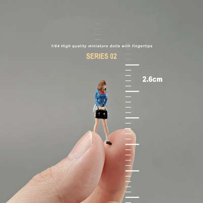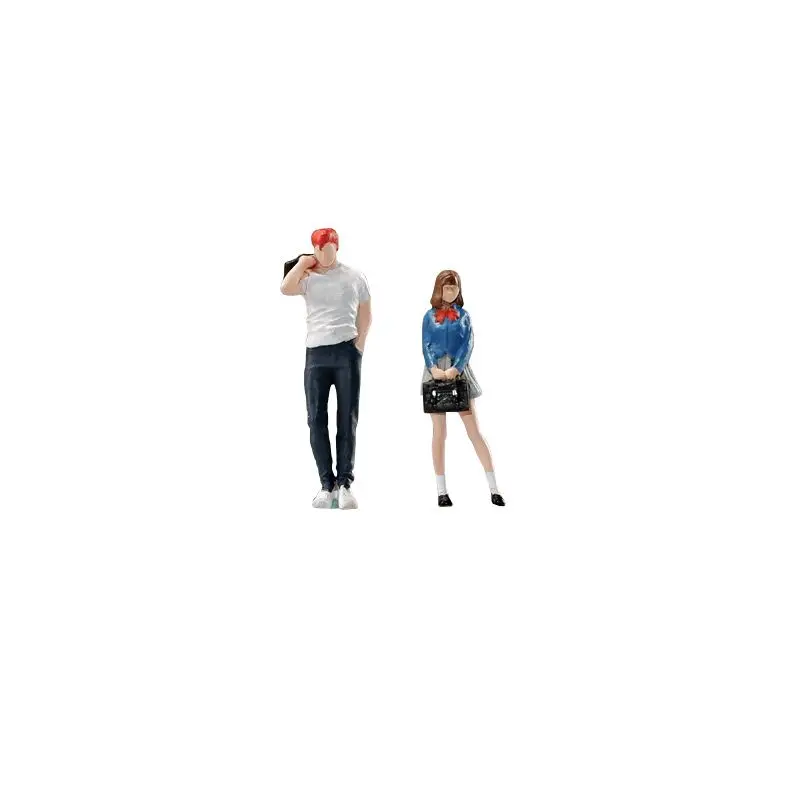 Introducing a stunning 1/64 scale miniature figure model made from resin, standing approximately 2.6 cm tall. This collectible features intricate hand-painted details, showcasing a vibrant blue jacket with a red bow tie for the female figure, and a casual white t-shirt paired with dark pants for the male figure. Perfect for hand DIY painting, home decoration, car model matching, or miniature photography, these delicate figures are designed for ages 14 and up. Note that slight imperfections may be present due to the handcrafted process, and the figures are not waterproof. Available in color options C, A, B, and a 2PCS set.