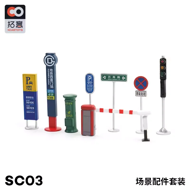 This XCARTOYS Miniature Car Model set offers an engaging diorama of traffic facility accessories, perfectly scaled at 1/64 for diecast toy cars. Its vibrant color palette includes red, green, yellow, and blue, each thoughtfully designed to enhance visual interest. The set features an illuminated red and green traffic light mounted on a sleek black pole, along with various street signs on slender white poles. Iconic accessories like a yellow parking sign and a blue taxi sign complement the scene, while a green mailbox and red barrier gate provide an urban touch. Crafted for ages 14 and up, it promises quality and endless fun for enthusiasts.