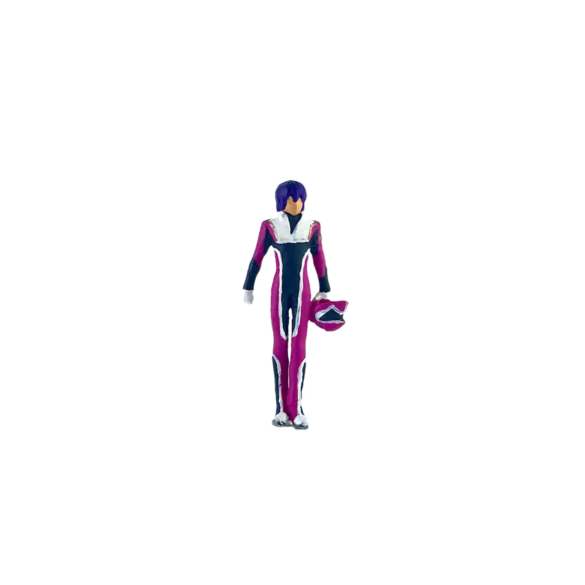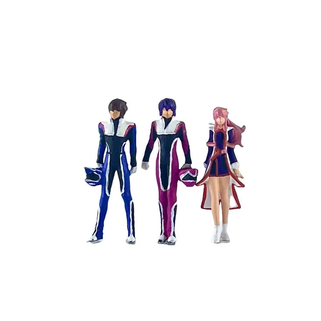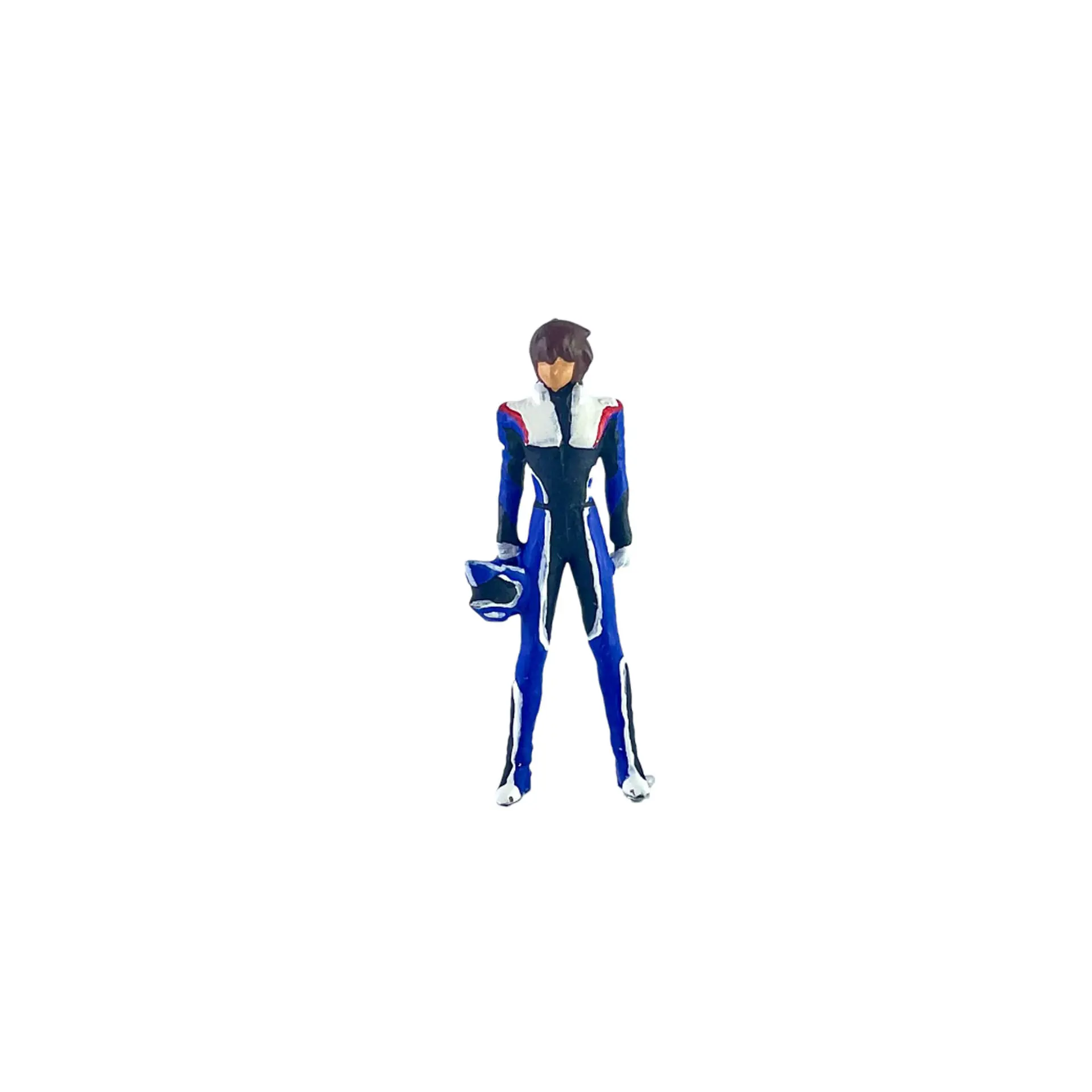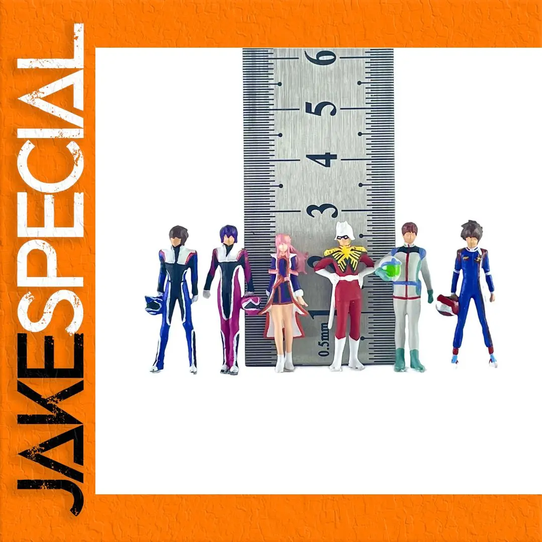 Discover an exquisite collection of six 1/64 scale miniature figures, each measuring approximately 2.8CM to 3.0CM in height, crafted from high-quality resin and hand-painted with vibrant Japanese Tamiya paint. This meticulously detailed set includes unique outfits: a blue and white suit with a helmet, a purple and white suit with bent arms, an elaborate purple and white outfit with long pink hair, a striking red and black suit adorned with golden accents, a light grey suit with green accents holding a globe, and a classic pilot figure in blue and white. Perfect for micro photography and collection, these delicate models are designed for passionate enthusiasts who appreciate the artistry in miniature figures.