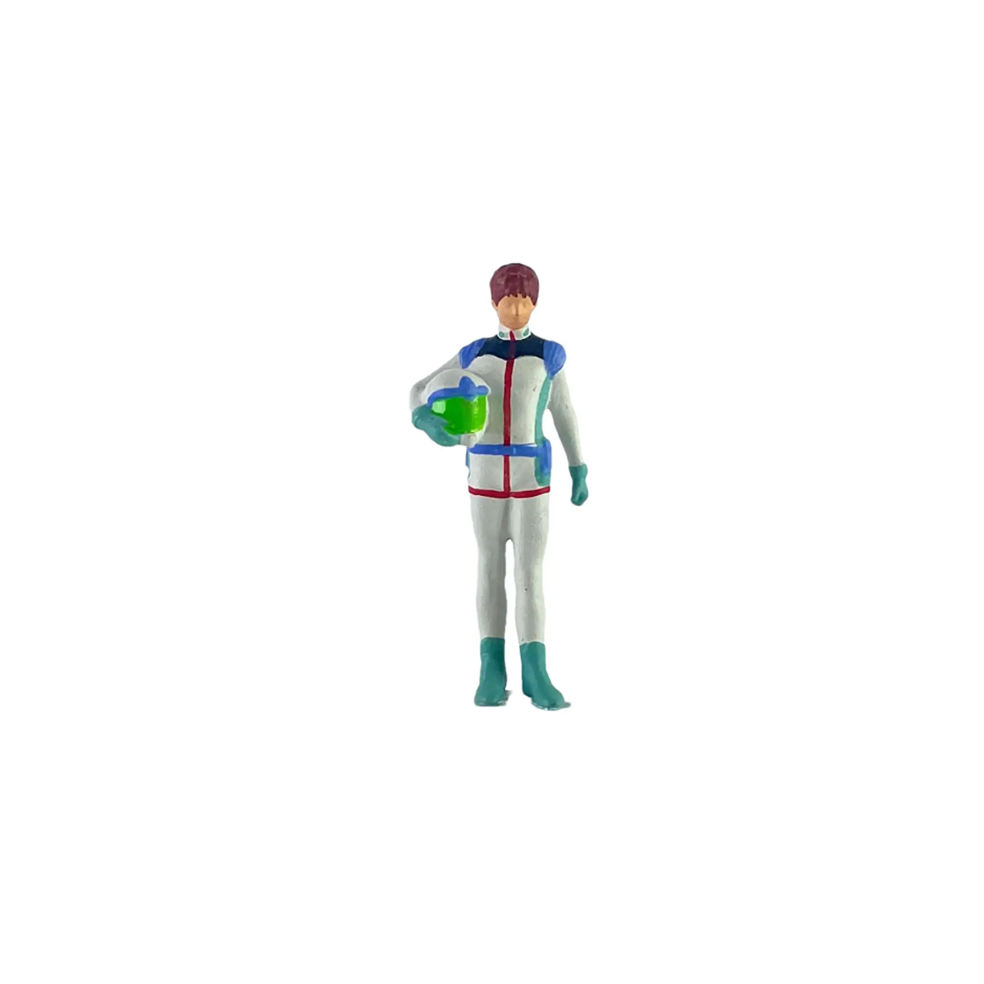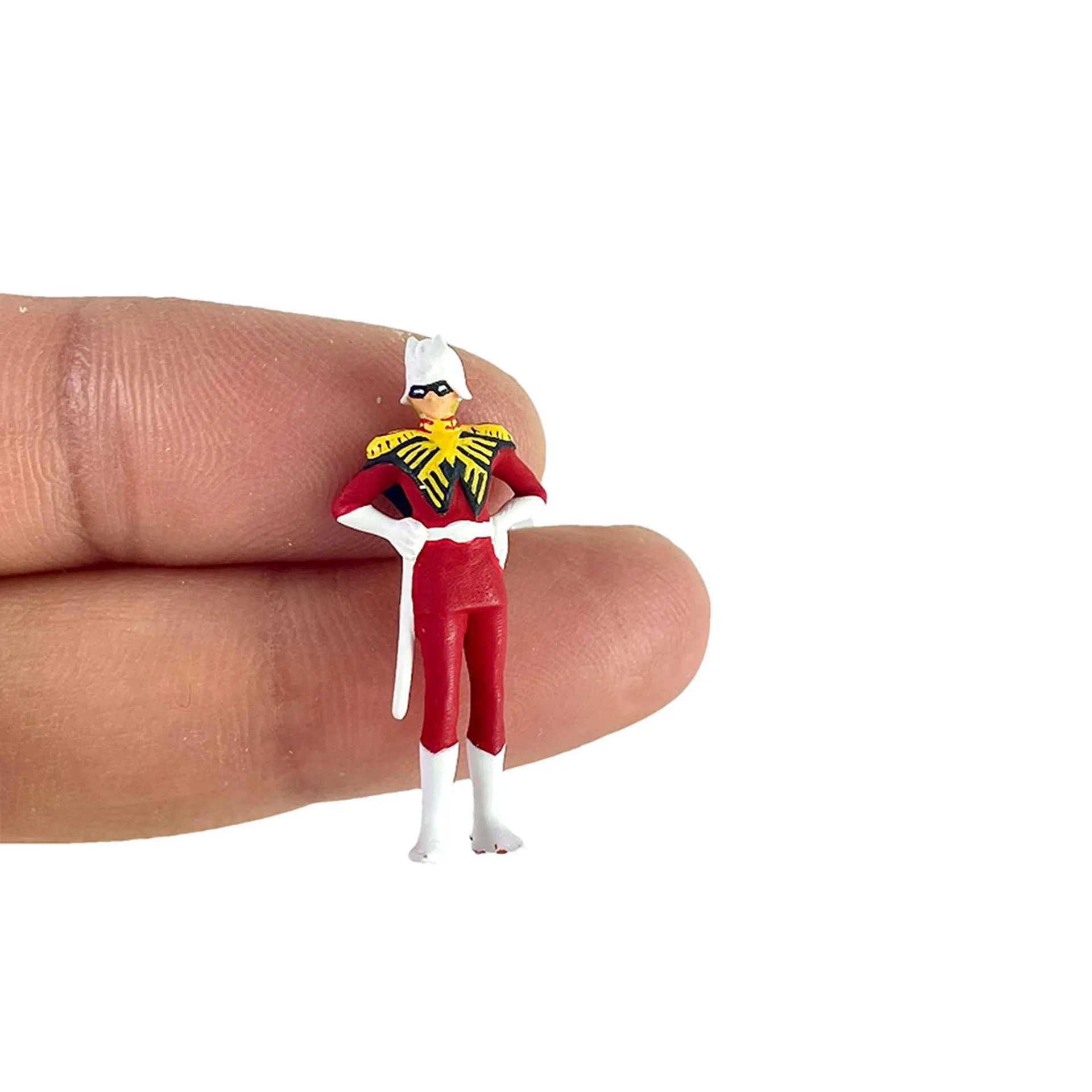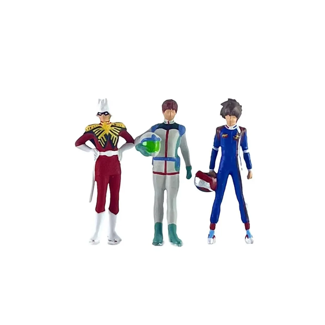 Discover an exquisite collection of six 1/64 scale miniature figures, each measuring approximately 2.8CM to 3.0CM in height, crafted from high-quality resin and hand-painted with vibrant Japanese Tamiya paint. This meticulously detailed set includes unique outfits: a blue and white suit with a helmet, a purple and white suit with bent arms, an elaborate purple and white outfit with long pink hair, a striking red and black suit adorned with golden accents, a light grey suit with green accents holding a globe, and a classic pilot figure in blue and white. Perfect for micro photography and collection, these delicate models are designed for passionate enthusiasts who appreciate the artistry in miniature figures.