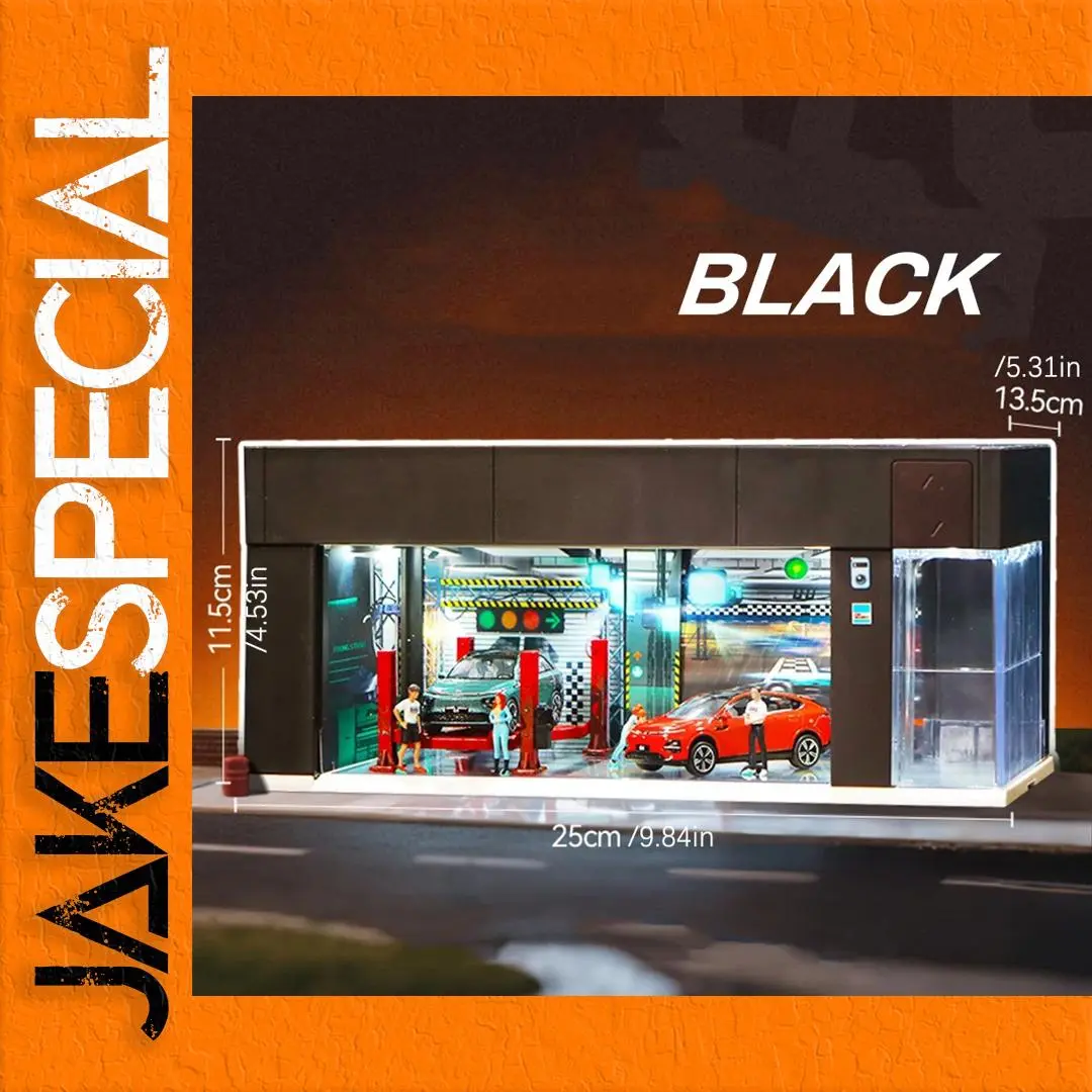 Imagine showcasing your cherished 1/64 scale toy cars in this sleek and modern garage model. The garage stands at 11.5 centimeters (4.53″) in height and reaches 25 centimeters (9.84″) in width, making it a striking piece for any collector's display. Crafted from durable ABS plastic and acrylic, this black garage features clear panels for an unobstructed view of your prized models. Integrated lighting enhances the aesthetic, creating an inviting showcase. With its electric shutter door design (non-electric, no batteries required), storage, and dust-proof features, this garage is perfect for any enthusiast wanting a blend of style and function.