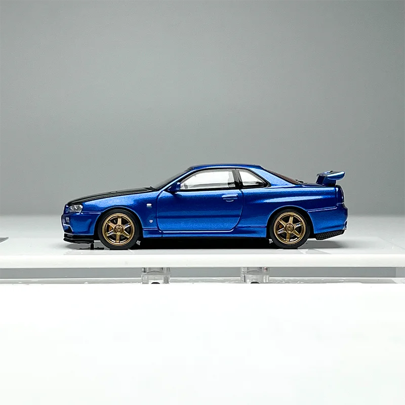 - The vivid blue body with black accents on the hood and side mirrors highlights the sporty and dynamic look of the GTR R34, ideal for car lovers and collector’s showcases alike.