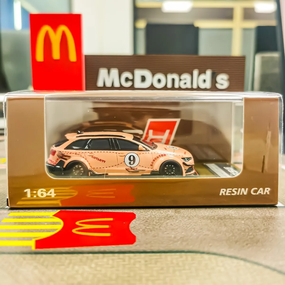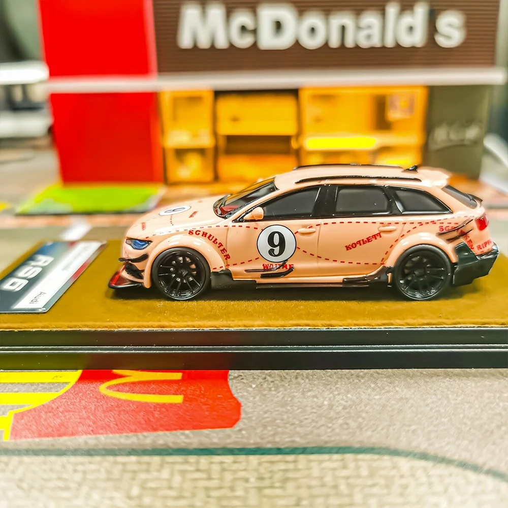 This stunning 1/64 scale resin model car of the RS6 2NCS Wagon embodies the essence of racing elegance with its dynamic pink color. The sleek design showcases a powerful front grille, a low profile, and remarkable features such as a sporty front splitter and rear diffuser. Adorned with racing decals, including the number “9” and the word “SCHULZ,” this model achieves a fantastic blend of visual appeal and thrilling detail. The tinted windows and black alloy wheels enhance its sporty aesthetic, while the smooth golden-brown base with a printed label solidifies its place as a must-have collectible for enthusiasts.