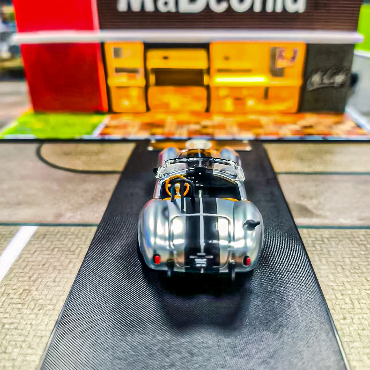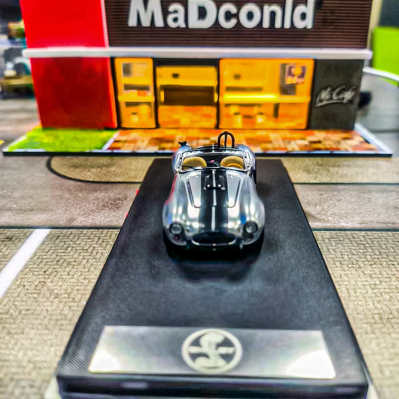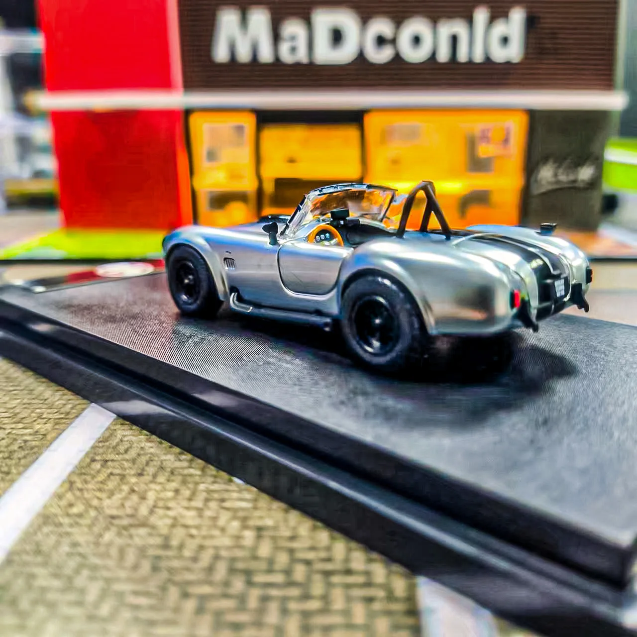 This 1/64 scale model of the Shelby Cobra 427S/C is a remarkable diecast representation of the classic car. Finished in a striking glossy silver, it features iconic black racing stripes that add a sporty flair. The open-top design showcases the model's intricate details like the sculpted hood, prominent fenders, and aggressive grille. Crafted mainly from high-quality metal, it promises durability and a solid feel. The model's black wheels provide a beautiful contrast against the silver body, while the textured black display base completes the overall aesthetic appeal, making it an exquisite collectible for enthusiasts.
