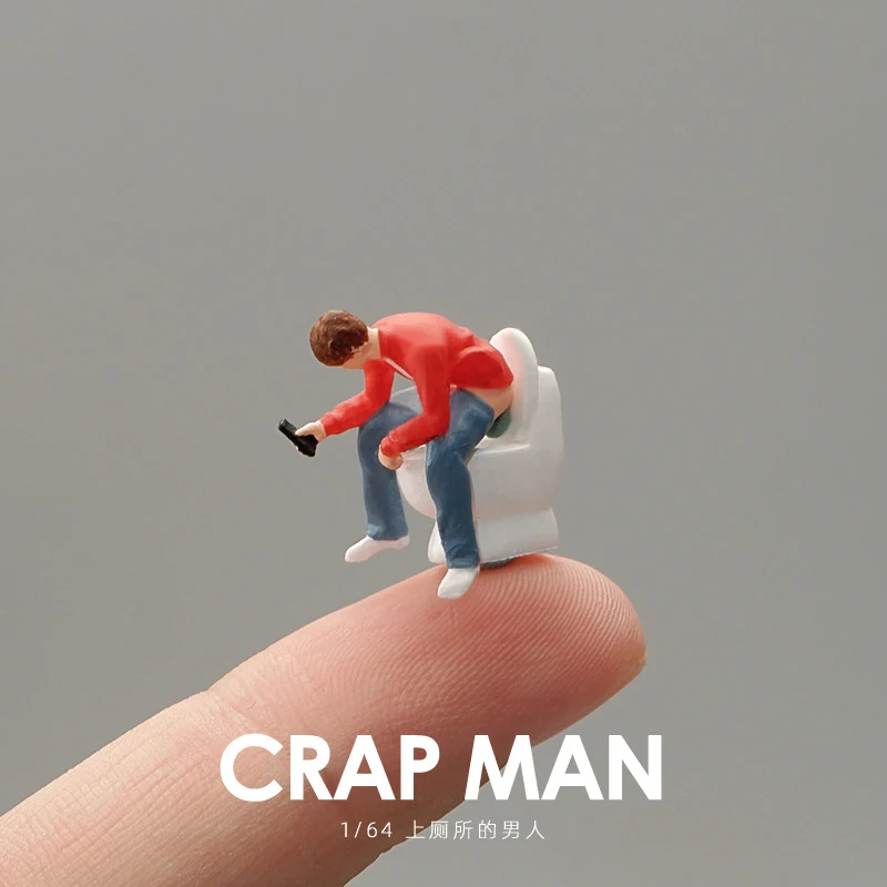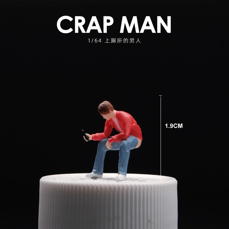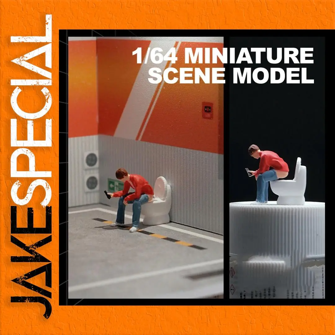 The 1/64 scale miniature figure model portrays a seated male character engrossed in his smartphone, clad in a bright red shirt, blue jeans, and white sneakers. Seated on a realistically designed white toilet, this detailed figure stands approximately 2.6 cm high. Crafted from resin with a hand-painted finish, it features vibrant colors and an expressive design. Ideal for DIY crafts, car decoration, and miniature photography, the delicate figure adds charm to any diorama scene. Perfect for collectors, this model enhances themed displays and is meant for adult enthusiasts. Handle with care to preserve its exquisite details.