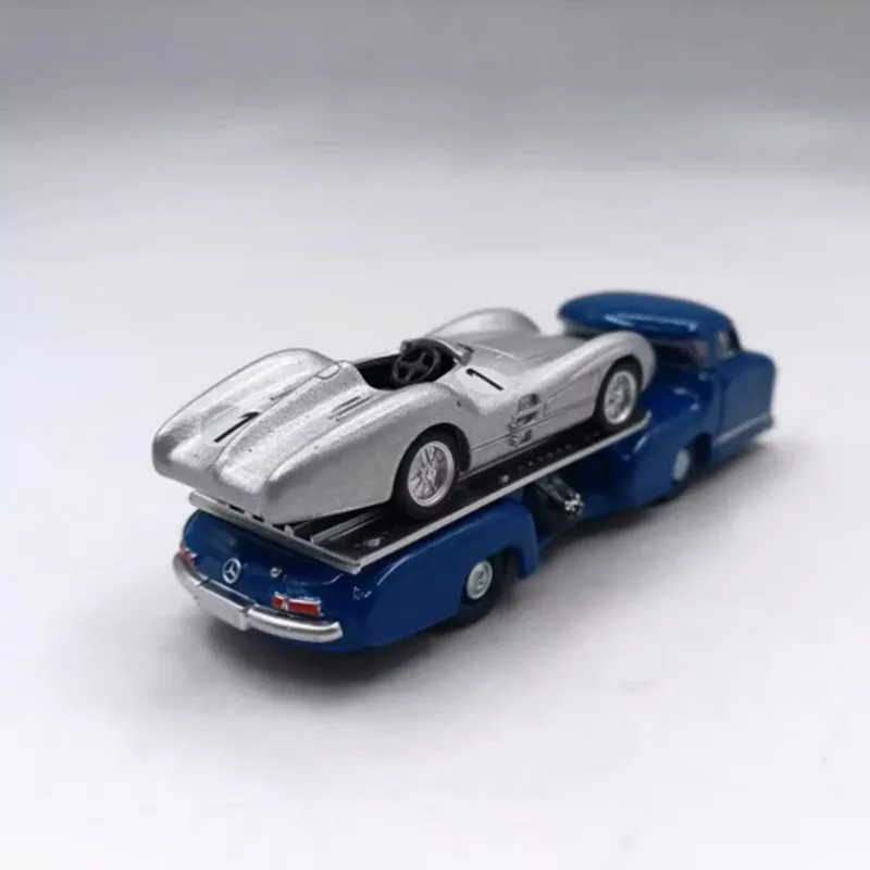 Discover the charm of this meticulously crafted diecast trailer transporter model, perfect for collectors and enthusiasts alike. This model features a vibrant blue alloy finish, providing a striking metallic appearance that captures vintage transporter style with modern detailing. Its detailed cab showcases rounded contours, clear plastic windows, and realistic front headlights, adding to its authenticity. The trailer section has a silver textured surface with perforated side rails, emphasizing structural realism. Whether displayed on a shelf or as a decorative piece, this model brings an elegant touch to any collection. Its handcrafted design offers remarkable realism and durability, making it an ideal gift or a treasured addition for passionate collectors looking to showcase intricate automotive craftsmanship.