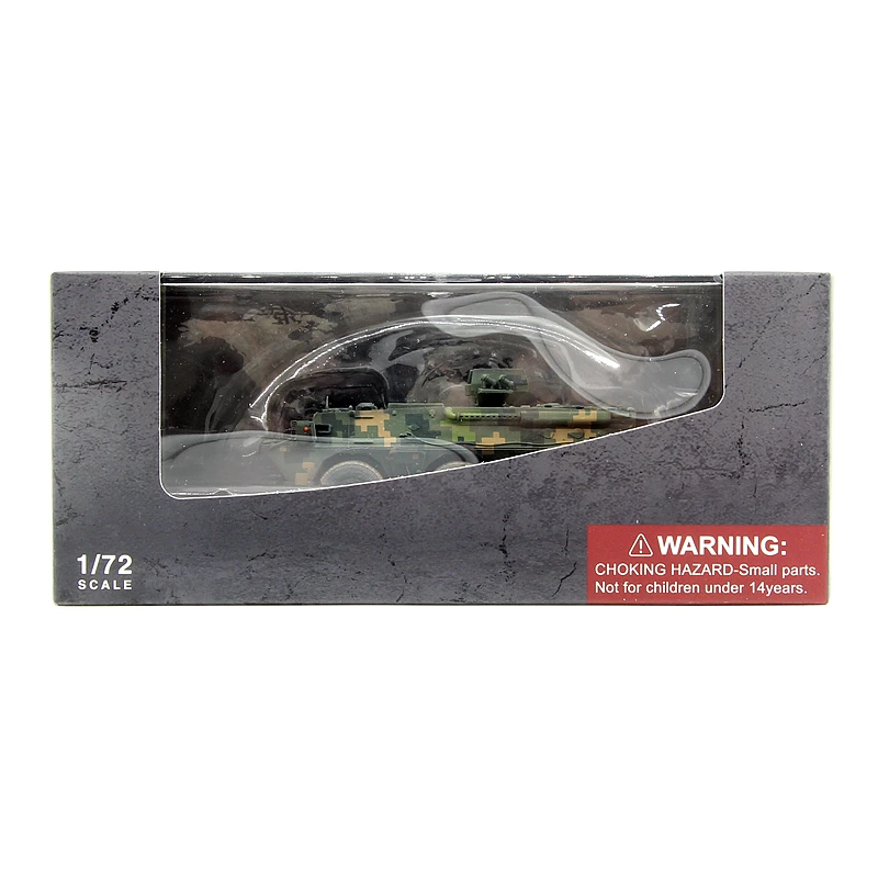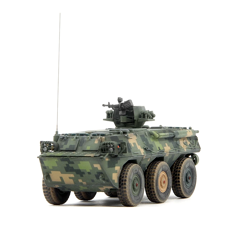 The 1/72 scale Chinese ZSL-92 wheeled armored vehicle model is an exquisite collectible featuring a striking jungle digital camouflage pattern in shades of green, brown, and beige. Measuring approximately 93mm long, 40mm wide, and 45mm high, this model combines durability and realism with its alloy and ABS plastic construction. It includes intricate details such as a movable turret, a machine gun, and an antenna, alongside textured wheels that showcase tread details. Perfect for adult collectors, this model offers a captivating display, enhancing any collection or diorama.