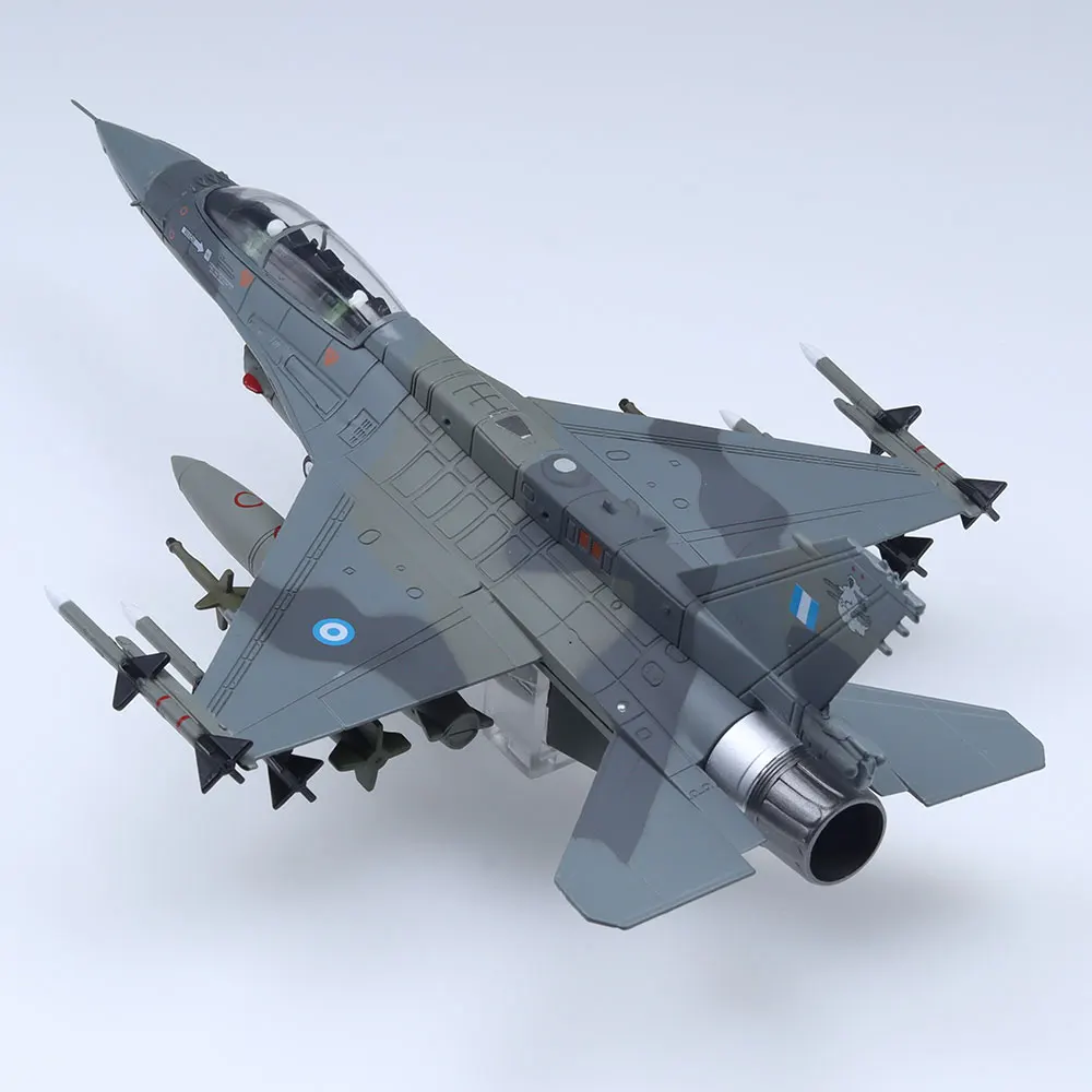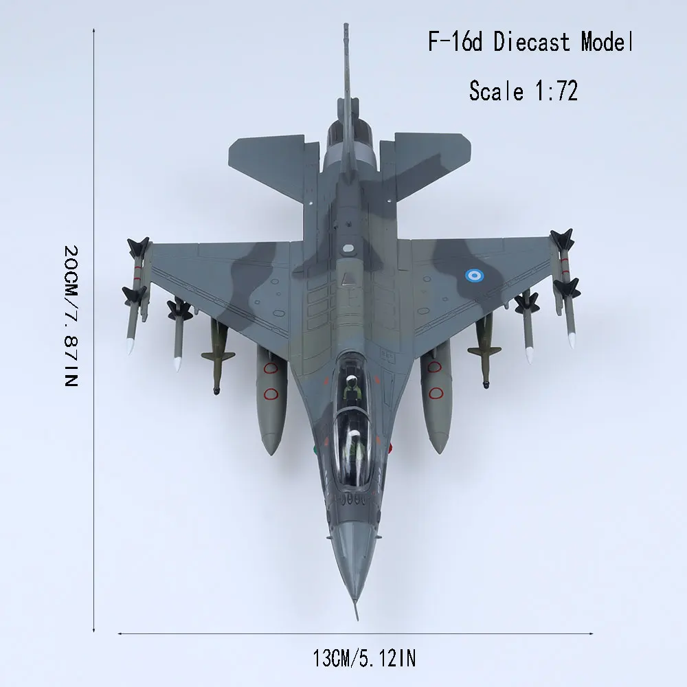 Experience the thrill of owning a meticulously crafted 1/72 scale F-16D fighter jet replica, designed for aviation enthusiasts and collectors alike. Measuring 20 cm in length and width with a height of 9 cm, this detailed model weighs about 420 grams, making it a perfect display piece. Constructed from high-quality alloy and plastic, it features a sleek, aerodynamic fuselage with a modern gray camouflage pattern that mimics real military aircraft. The transparent canopy reveals intricate cockpit figures in green flight suits and helmets, adding vibrant realism. Complete with realistic insignia, stylized emblem at the tail fin, and attached missiles, this model captures the fighter's combat-ready appearance. Mounted on a black stand, it portrays mid-flight motion that enhances its visual impact.