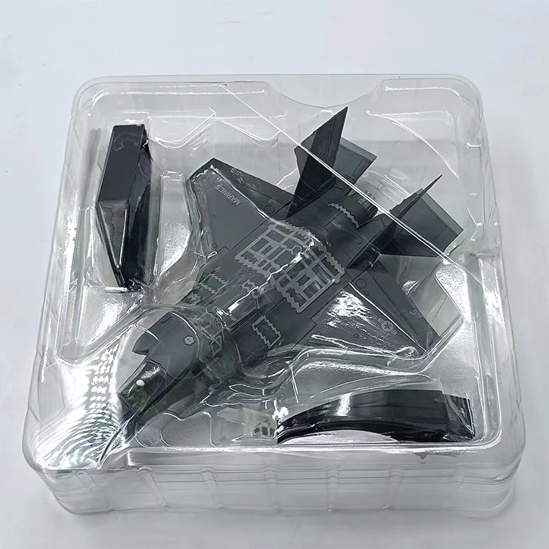 Imagine adding a stunning replica of the F-35B fighter jet to your collection. This meticulously crafted model captures every detail of the real aircraft, with a sleek, angular design highlighted by a dark gray and black matte finish. Its realistic panel lines, subtle white and light gray accents, and finely detailed surface features bring the fighter to life. The transparent canopy with a green-tinted pilot figure adds a pop of color and authenticity. Mounted on a black stand at an eye-catching angle, this model showcases the fighter’s sharp swept-back wings and vertical stabilizers—each bearing authentic insignia—exuding a powerful militaristic aesthetic. Made from durable alloy metal combined with ABS, it provides a sturdy and highly detailed miniature of the iconic fighter jet. Perfect for display in any collection or office.