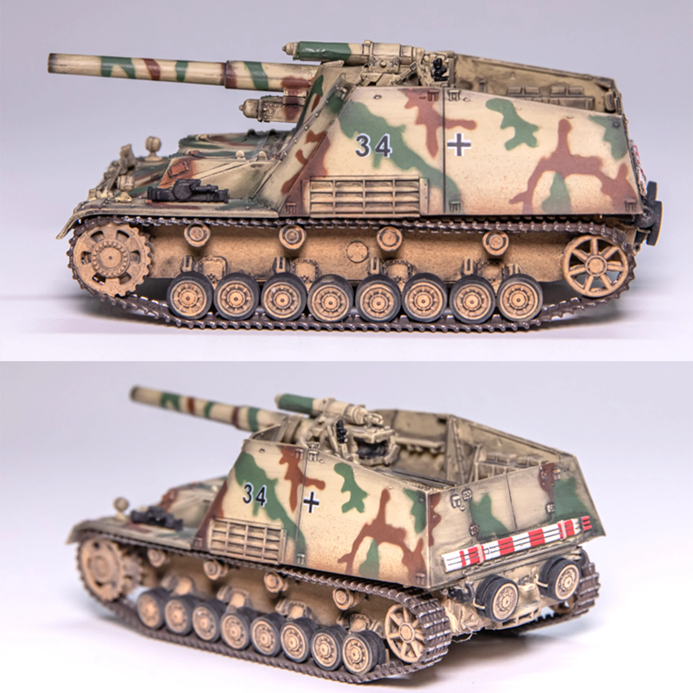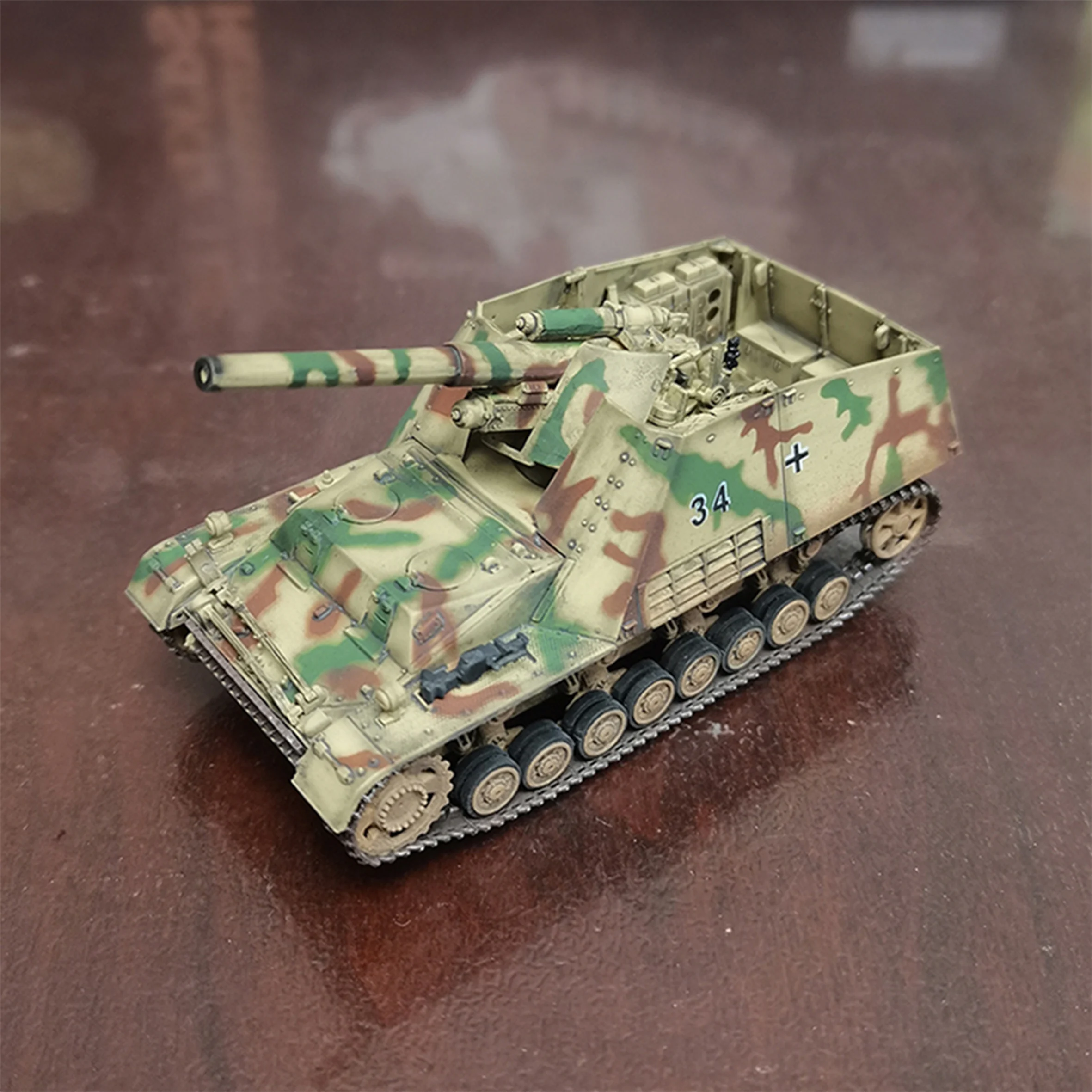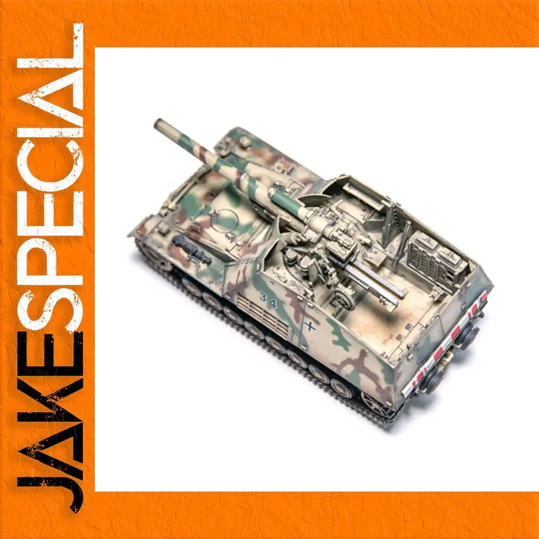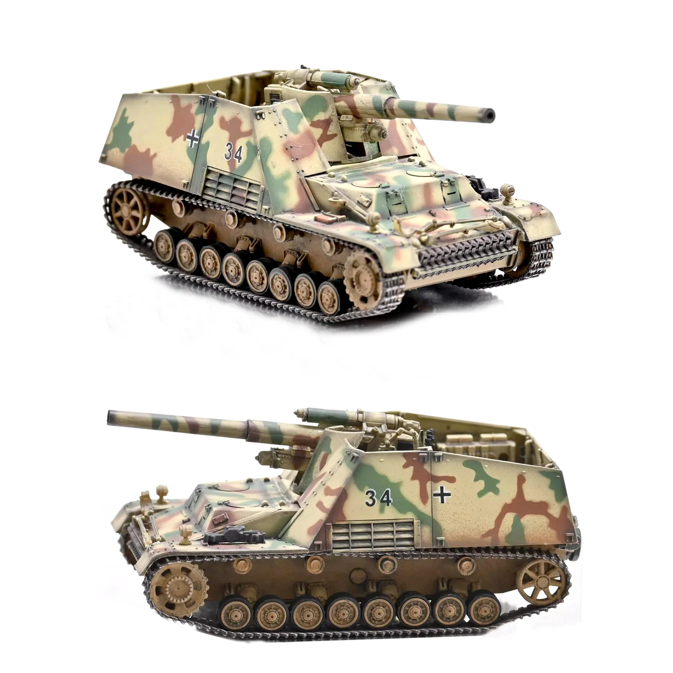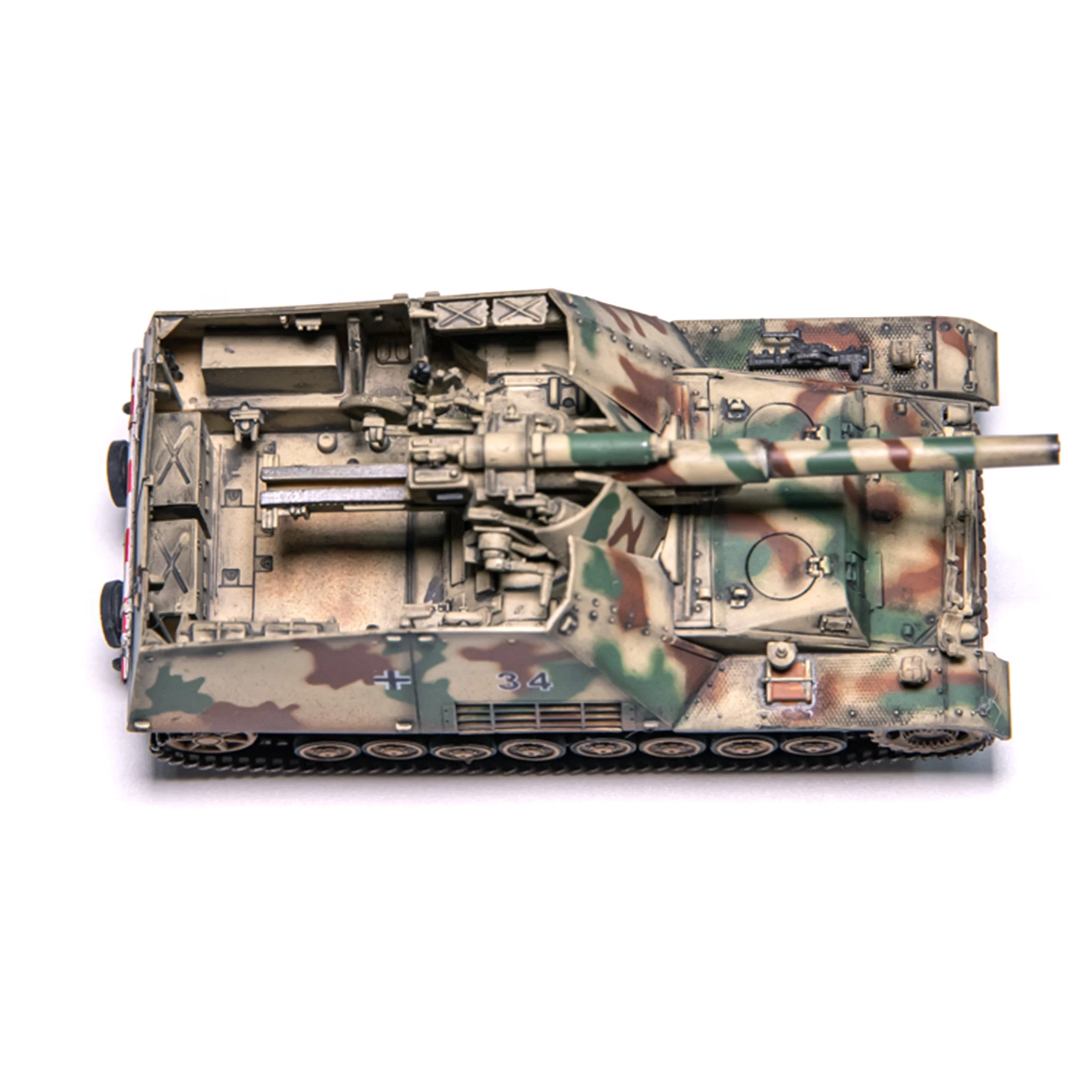 Step into the world of military history with this exquisite 1/72 scale model of the Germany Sd Kfz.165 Self Propelled Tank (Model Number: 63177). This meticulously crafted model features a stunning camouflaged exterior in shades of green, brown, and beige, embodying the classic look of World War II German tanks. Its intricately designed body showcases precise mechanical details, from the long green barrel to the prominent tactical number “34” and authentic white cross symbol. Perfect for collectors, this model stands out on any display with dimensions of approximately 11.5 cm in length, 4.2 cm in width, and 4.4 cm in height, making it a remarkable addition to your collection.