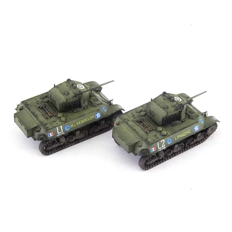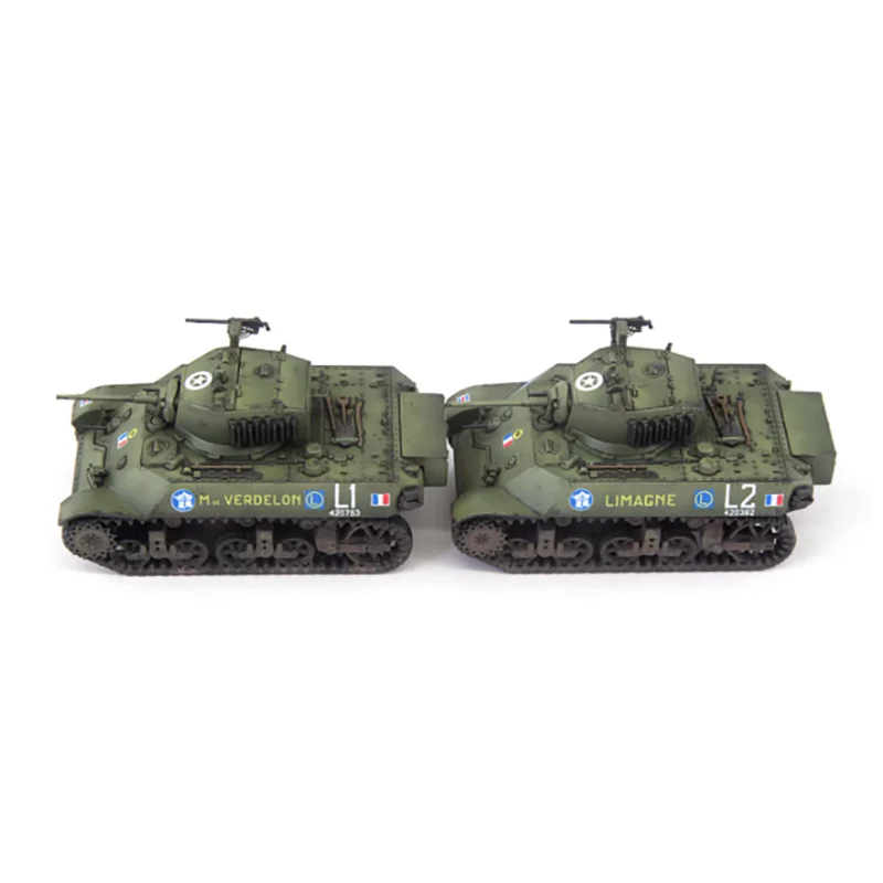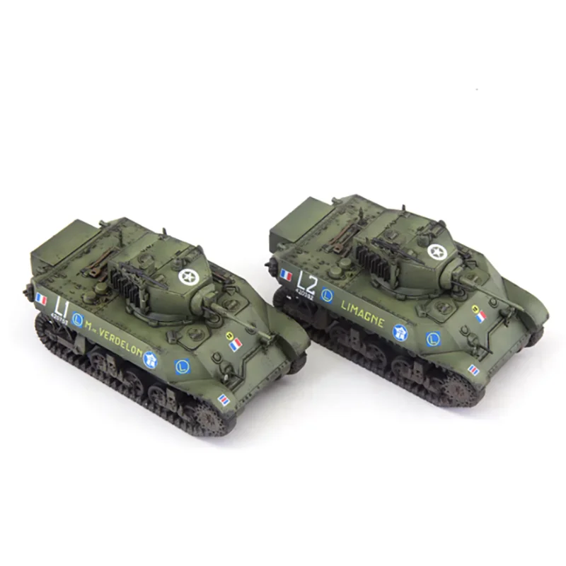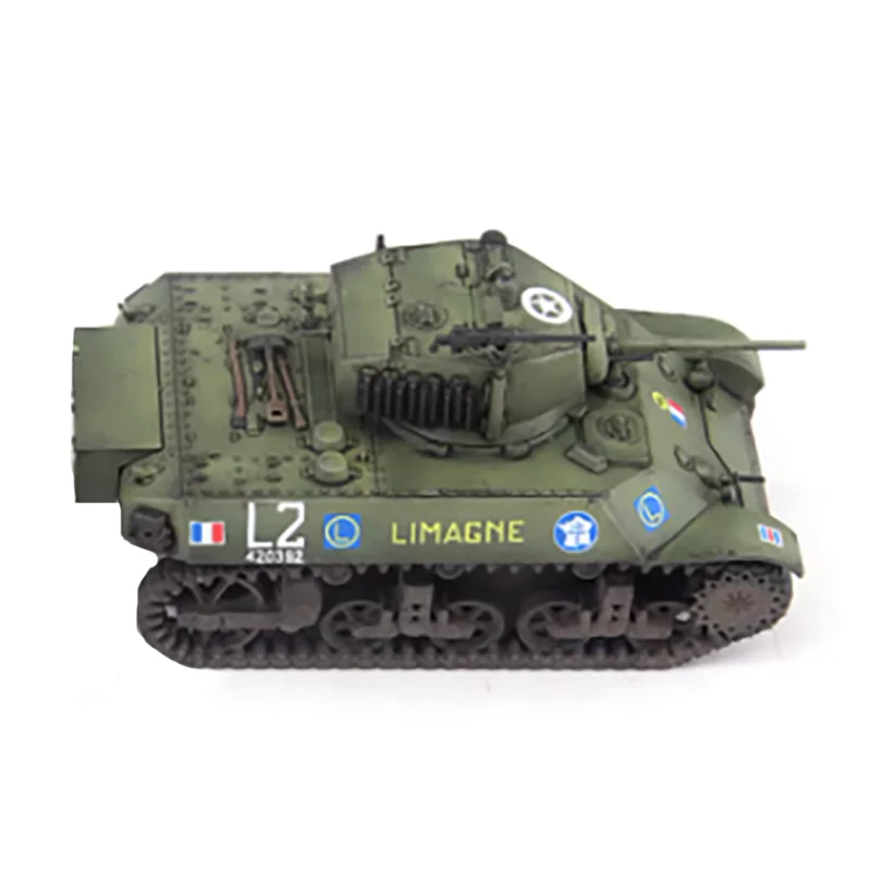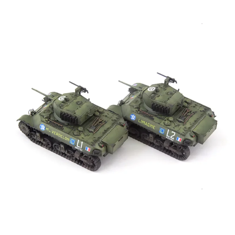 Experience the highly detailed craftsmanship of this 1/72 scale M3A3 RP1044 tank set, perfect for collectors and enthusiasts who value authenticity. Crafted from alloy and plastic, these static display models capture the rugged and tactical appearance of the original military vehicle with precise accuracy. The models feature a sleek, matte olive green finish, complemented by meticulously painted decals, markings, and surface textures that highlight their realistic armored details. Taking a closer look, you'll notice fine details such as rivets, panel lines, and authentic markings like “LIMAGNE” in yellow, a white and blue roundel, and a small flag decal, all enhancing their military aesthetics. These models are designed to evoke a sense of history and craftsmanship, perfect for display in your collection or as an impressive gift for history buffs.