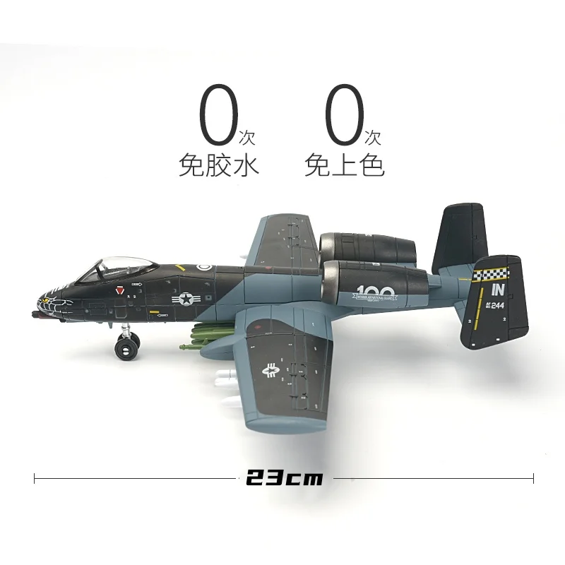 Experience the thrill of assembling the 1/72 scale A-10 Thunderbolt II attack plane model, measuring 23cm. This intricately designed model features a matte dark gray finish with lighter gray accents, complete with a clear canopy for cockpit visibility and a striking predator-like jaw design on the nose. The detailed wings showcase downward-sloping tips, mounted missiles, and light green ordinance, while the cylindrical jet engines are adorned with circular fan sections. With a sleek fuselage, realistic landing gear, and a checker-patterned tail, this plastic assembly model is perfect for enthusiasts. Compatible with models like Leopard2A7, Merkava, M1A2, T14, T90, and Apache.