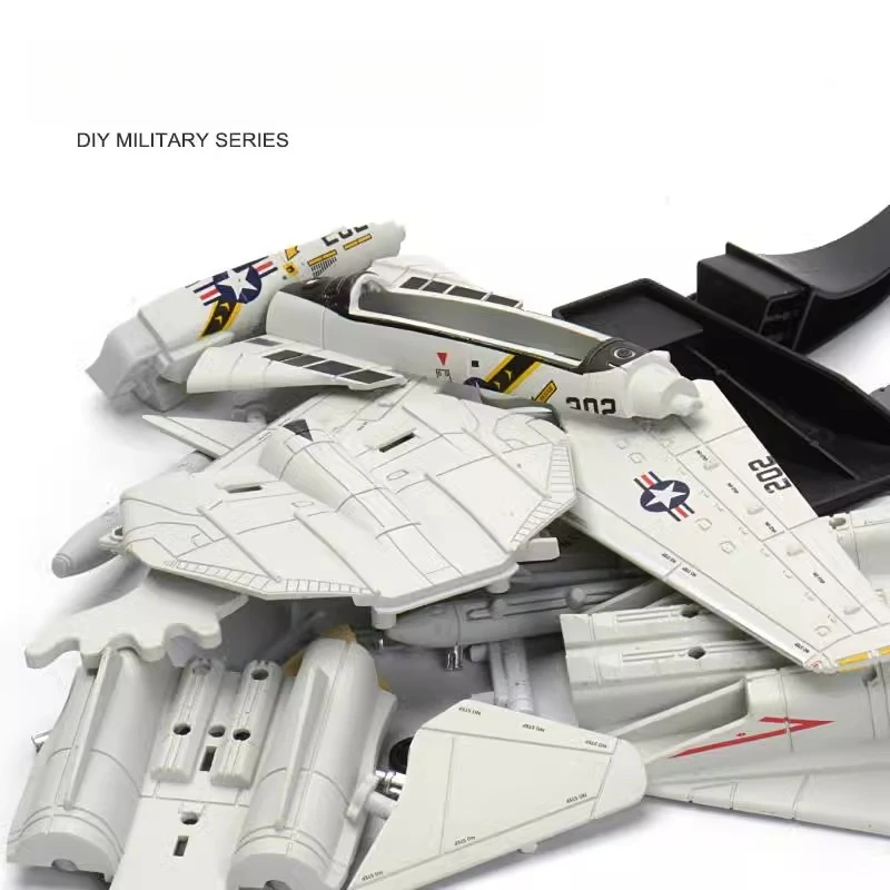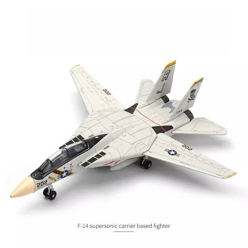 Experience the thrill of aviation with this 1/72 scale assembled model building block toy of the American F14 fighter jet. This glue-free, pre-colored model features a striking white body with a pale beige nose marked with the number “202” and U.S. Navy insignia. The aerodynamic design includes outstretched wings with black detailing and red accents, while the distinctive vertical stabilizers show bold symbols. With a detailed cockpit under a transparent canopy and realistic landing gear with black wheels, this model is crafted from durable plastic, making it a perfect addition for collectors and enthusiasts alike.