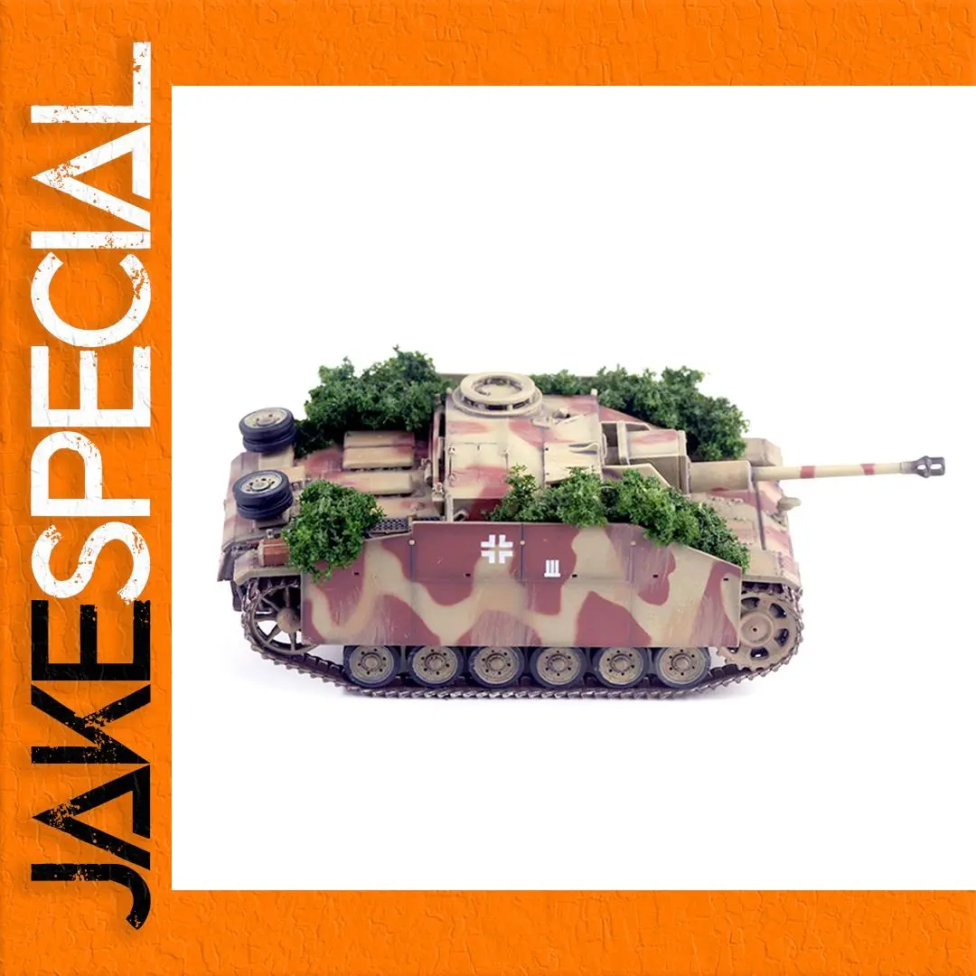 The stunning 1/72 scale model of the German STU GIII AUSF. G is designed with a unique Kursk shrub camouflage pattern, making it perfect for display or collection. With a robust and angular body in beige, features intricate abstract red and brown splotches that blend into a natural green backdrop. The model doesn't require batteries and is constructed from high-quality ABS and PVC plastic, ensuring durability. Its dimensions of approximately 11.2 cm x 4.1 cm x 4.2 cm perfectly encapsulate the precise details of the tank, including an elegant turret and realistic tracks that showcase a dirtied look, emphasizing authenticity and craftsmanship.