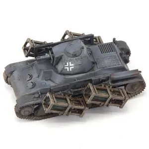Imagine adding this highly detailed armored vehicle tank to your collection, perfectly capturing the rugged and authentic military aesthetic. Crafted with precision, this model features weathered gray surfaces with panel lines, rivets, and hatches that evoke real-world battlefield wear. The rounded turret with its long cylindrical barrel offers a sleek, functional silhouette, complemented by angled armor plates and a detailed rear grille. Surrounding the body are textured tracks with prominent treads, adding gritty realism. Small wooden crates, with visible grain and supports, enhance the tactical appearance. Final touches like subtle shading and paint effects suggest dirt, wear, and battle history, making it an impressive display piece for any enthusiast or collector.