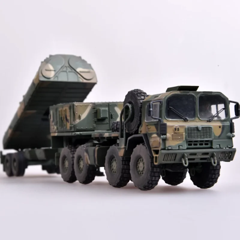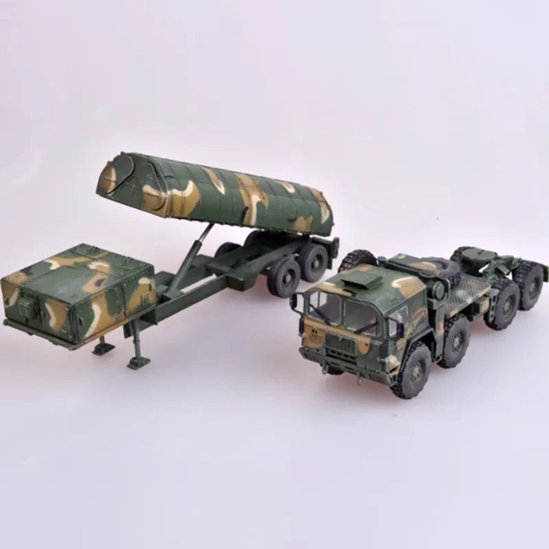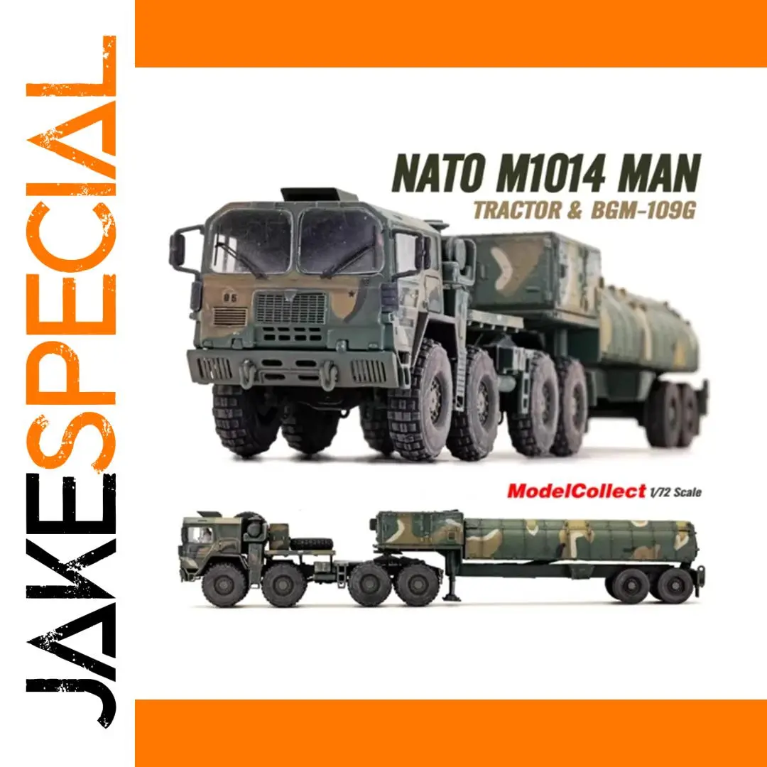 Bring home the highly detailed 1/72 scale plastic model of the M1014 MAN truck and BGM-109G missile system, perfect for collectors and enthusiasts. Crafted from durable plastic, this diecast model features a woodland camouflage pattern of green, tan, and brown hues, with intricately detailed components such as a sturdy cab with side mirrors, headlights, a grille, rugged off-road tires, a low-profile trailer with multiple wheels, and a large cylindrical missile with fins. Designed for static display, it requires assembly and careful handling due to small parts. Suitable for ages 14 and up, this realistic model enhances any military collection with its precise proportions and detailed craftsmanship.