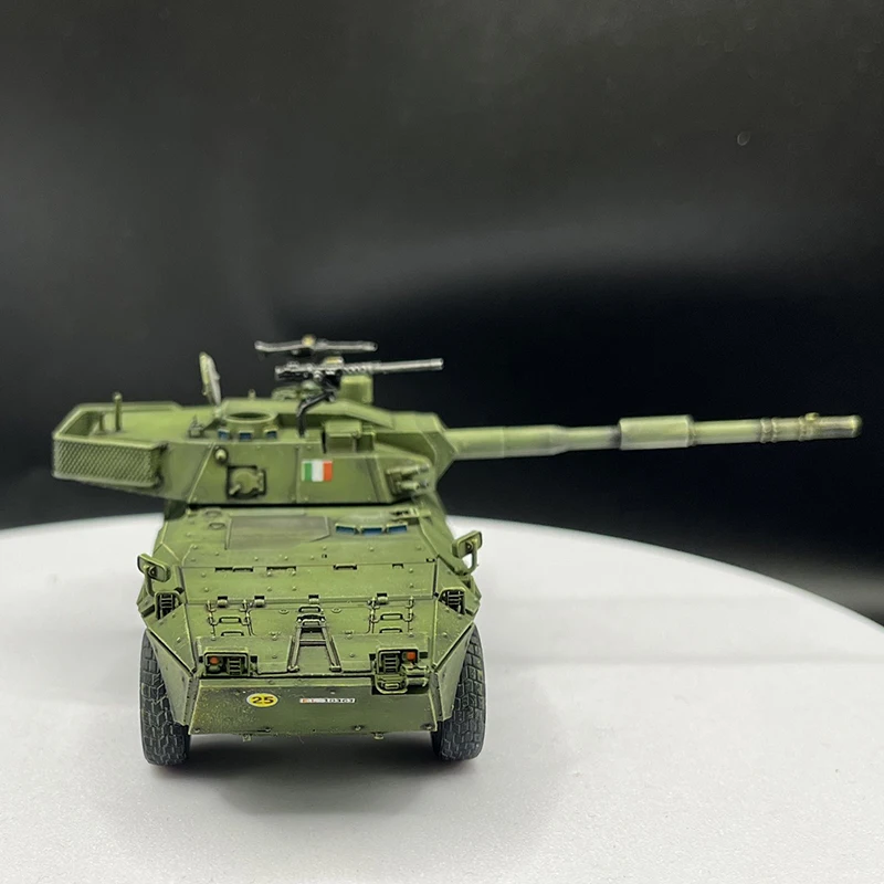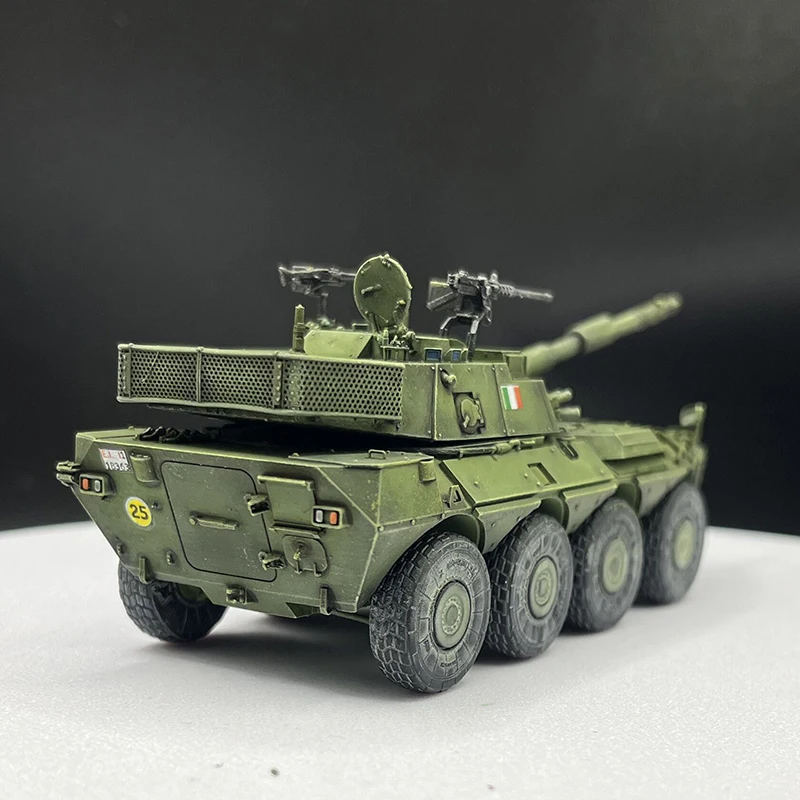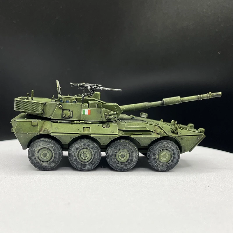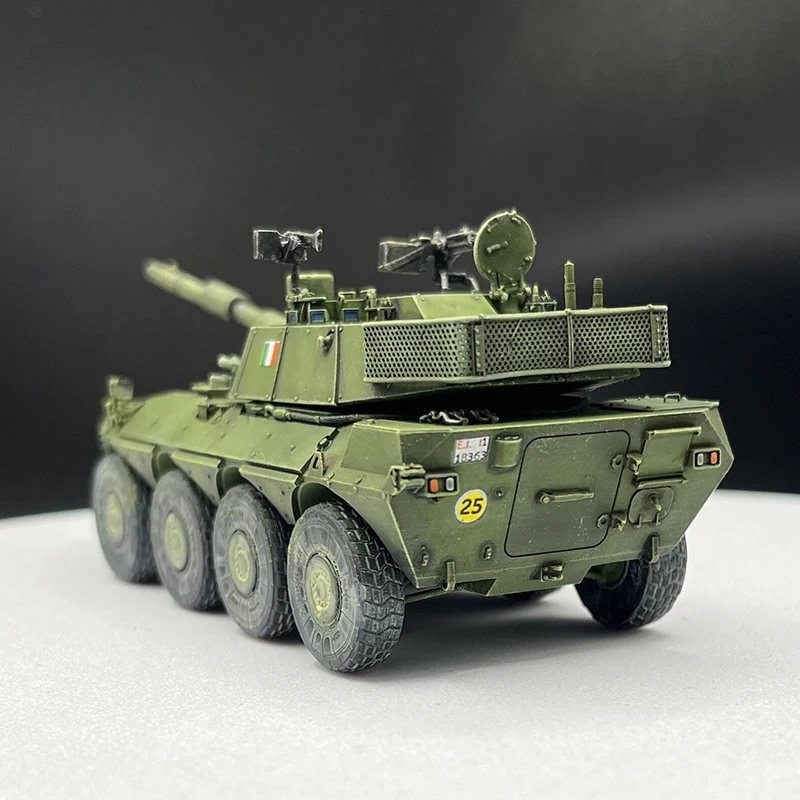 Step into the world of military history with this meticulously crafted 1/72 scale wheeled tank destroyer. Finished with precision, this model showcases an angular, modern design highlighted by sharp lines and a matte olive green finish that evokes tactical realism. The textured surfaces and detailed panel lines create a highly authentic appearance, making it an eye-catching display piece. The prominent main gun, a 120mm/L45 caliber barrel, extends confidently from the superstructure, demonstrating power and sophistication. Additional equipment like antennas, sensors, and small fixtures, painted in metallic and black accents, add depth and realism. Whether for display or collection, this model elevates any military history enthusiast's showcase with its refined craftsmanship and intricate detail.