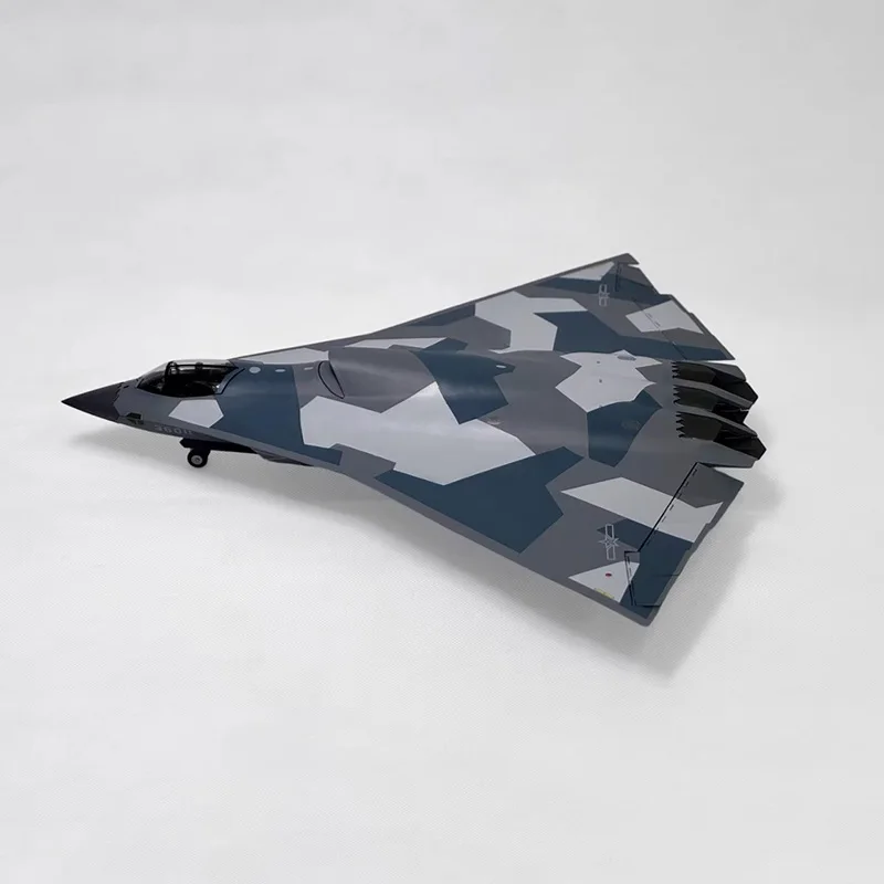 Experience the thrill of owning a meticulously crafted sixth-generation fighter aircraft with this detailed 1/72 scale diecast alloy model. Measuring approximately 13.89 centimeters in length, it features a sleek, modern design that captures the essence of advanced military jets. The metallic alloy surface offers a sturdy, high-quality finish, highlighting the aircraft’s aerodynamic silhouette with sharply swept-back delta wings, pointed tips, and outward-canting vertical stabilizers. The smooth fuselage, accented with a tactical camouflage pattern in shades of gray, white, and dark blue, enhances its realism. The seamlessly integrated cockpit canopy, tinted in a darker hue, adds a high-tech, stealthy look. Perfect for display, this model is an ideal addition to any collector’s set or office décor.