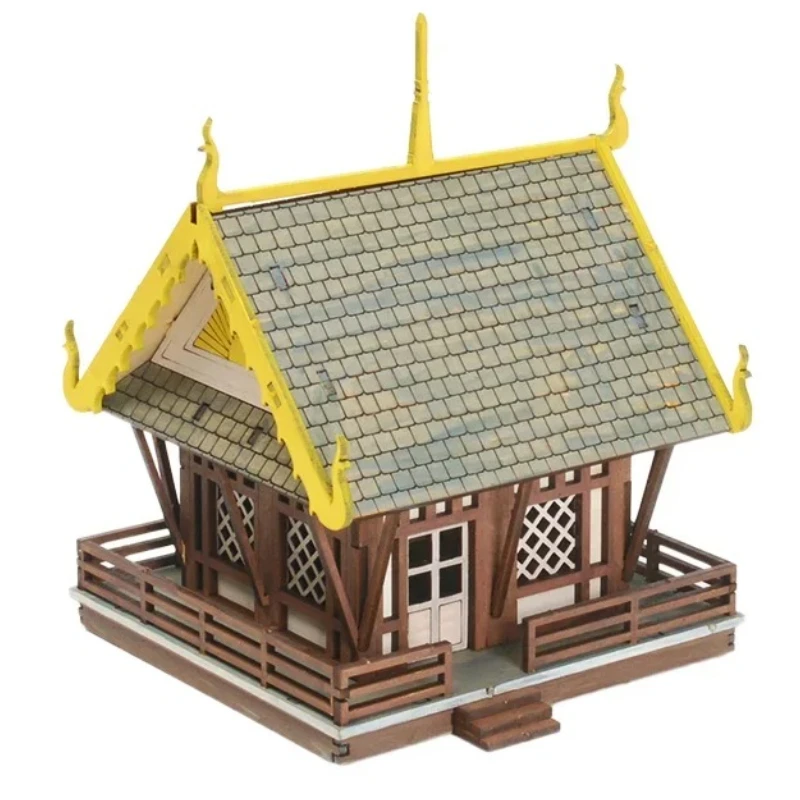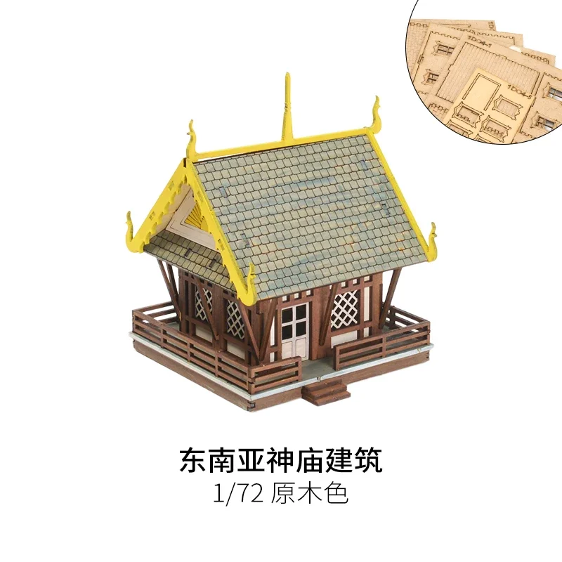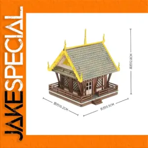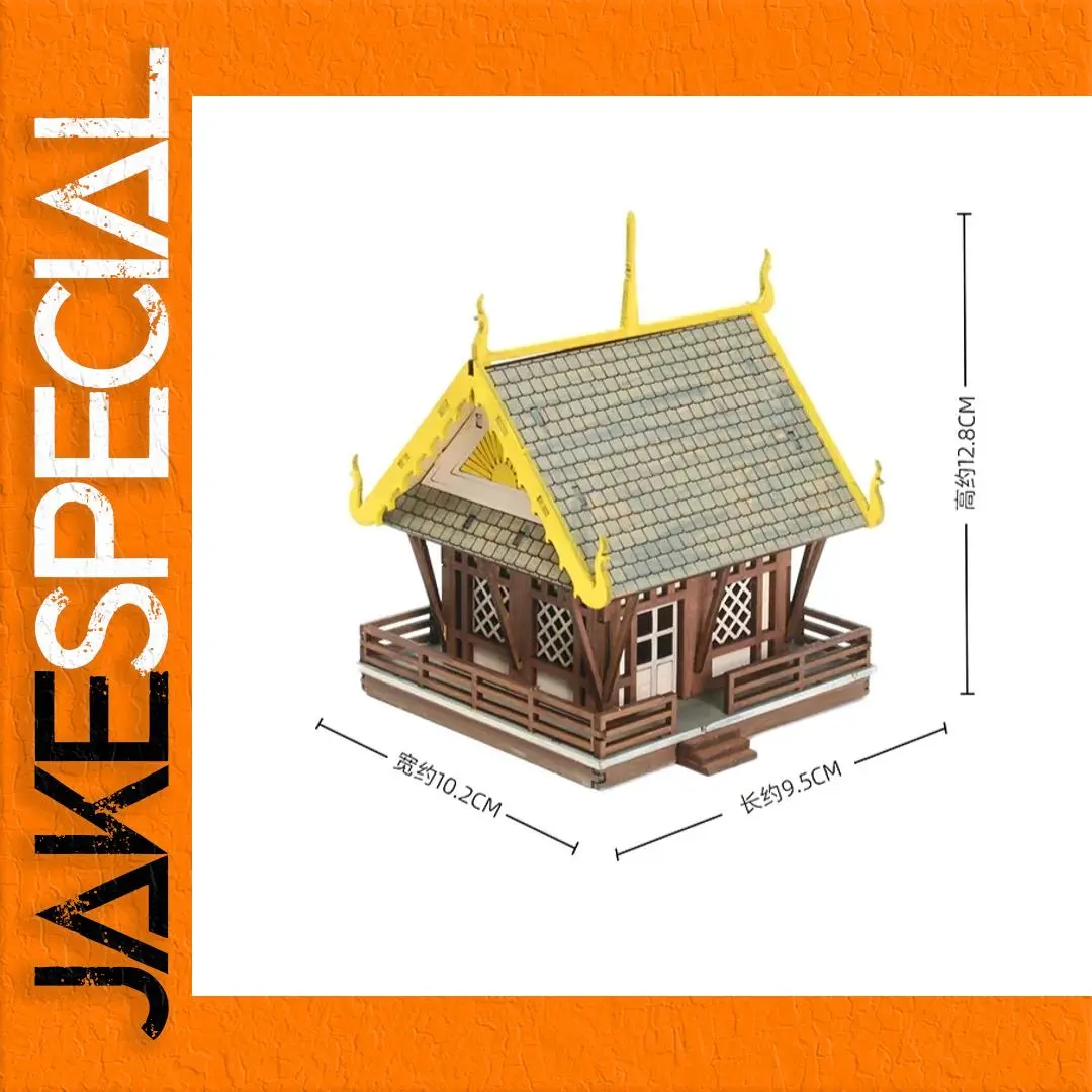 This exquisite 1/72 scale Southeast Asian Temple Architecture Assemble Model features meticulous craftsmanship with vibrant yellow-accented roofing that showcases a textured, tile-like appearance. The rustic brown wooden panels form the temple’s body, complemented by slatted sides for an authentic look and a semi-open view of the interior. The model includes a small entryway with decorative double doors, reflecting traditional construction charm. Measuring approximately 12.8 cm in height, 10.2 cm in width, and 9.5 cm in length, it is perfect for display. As a DIY handmade toy, this model invites you to enjoy both its assembly and the stunning finished piece.