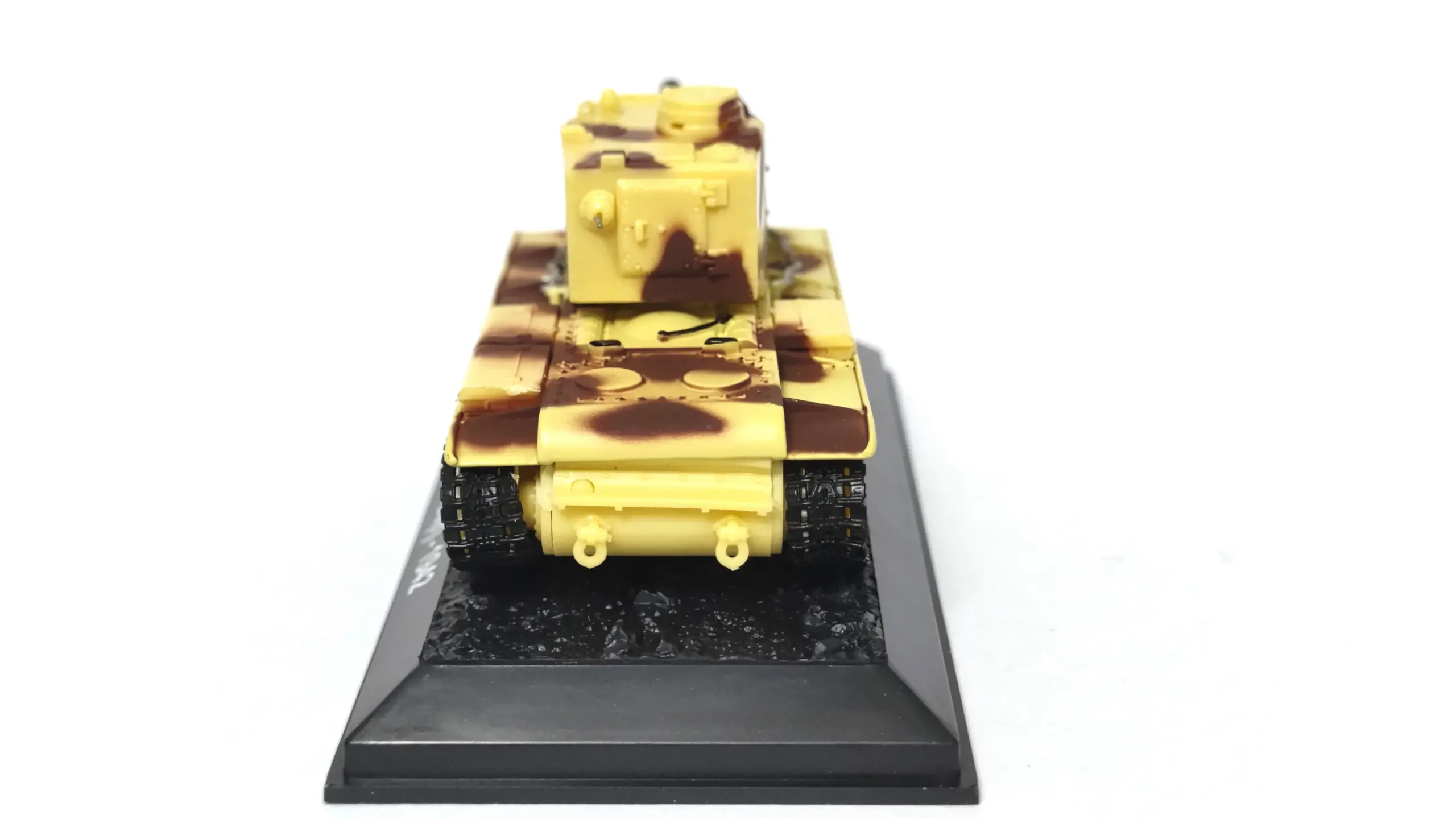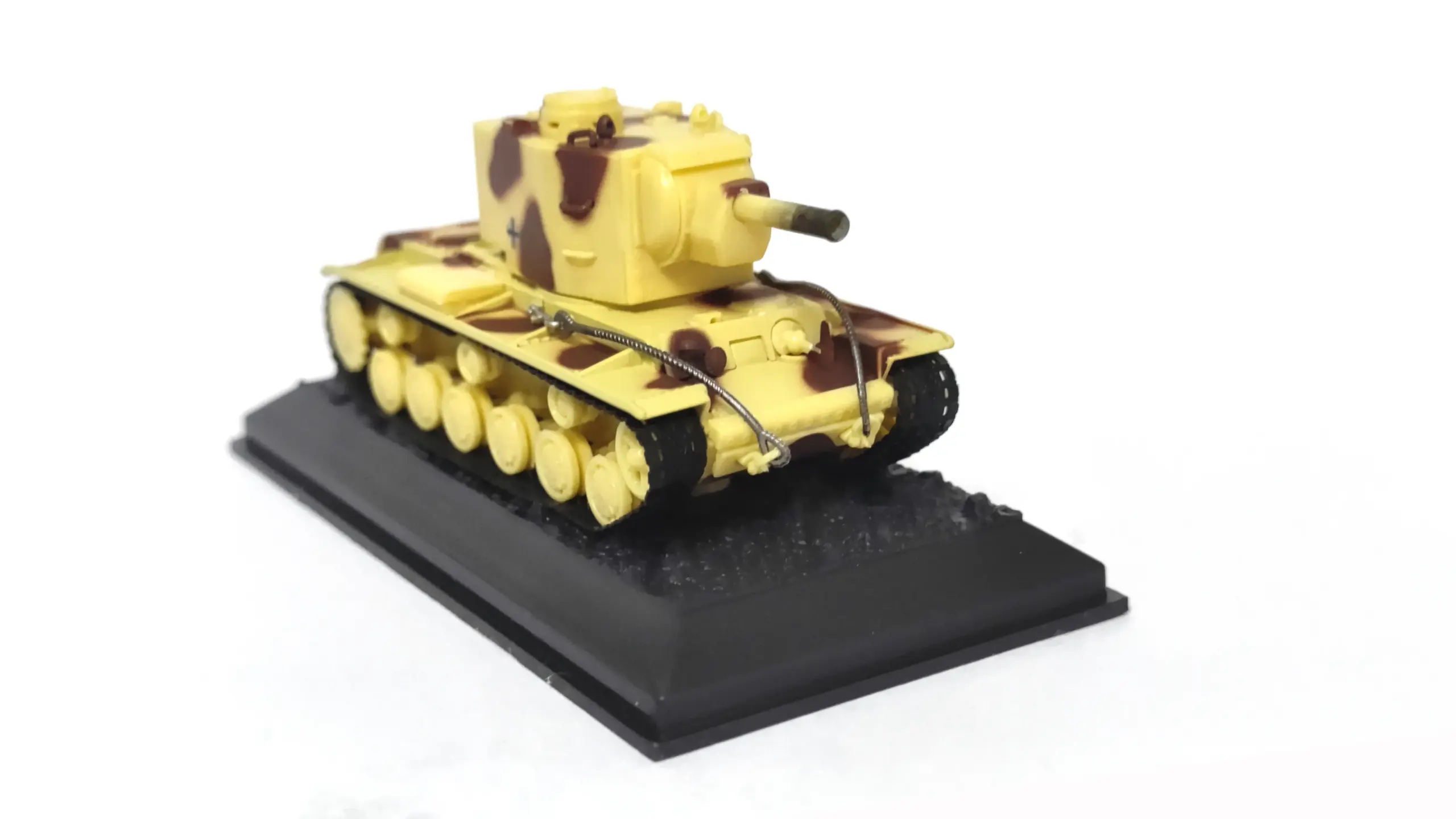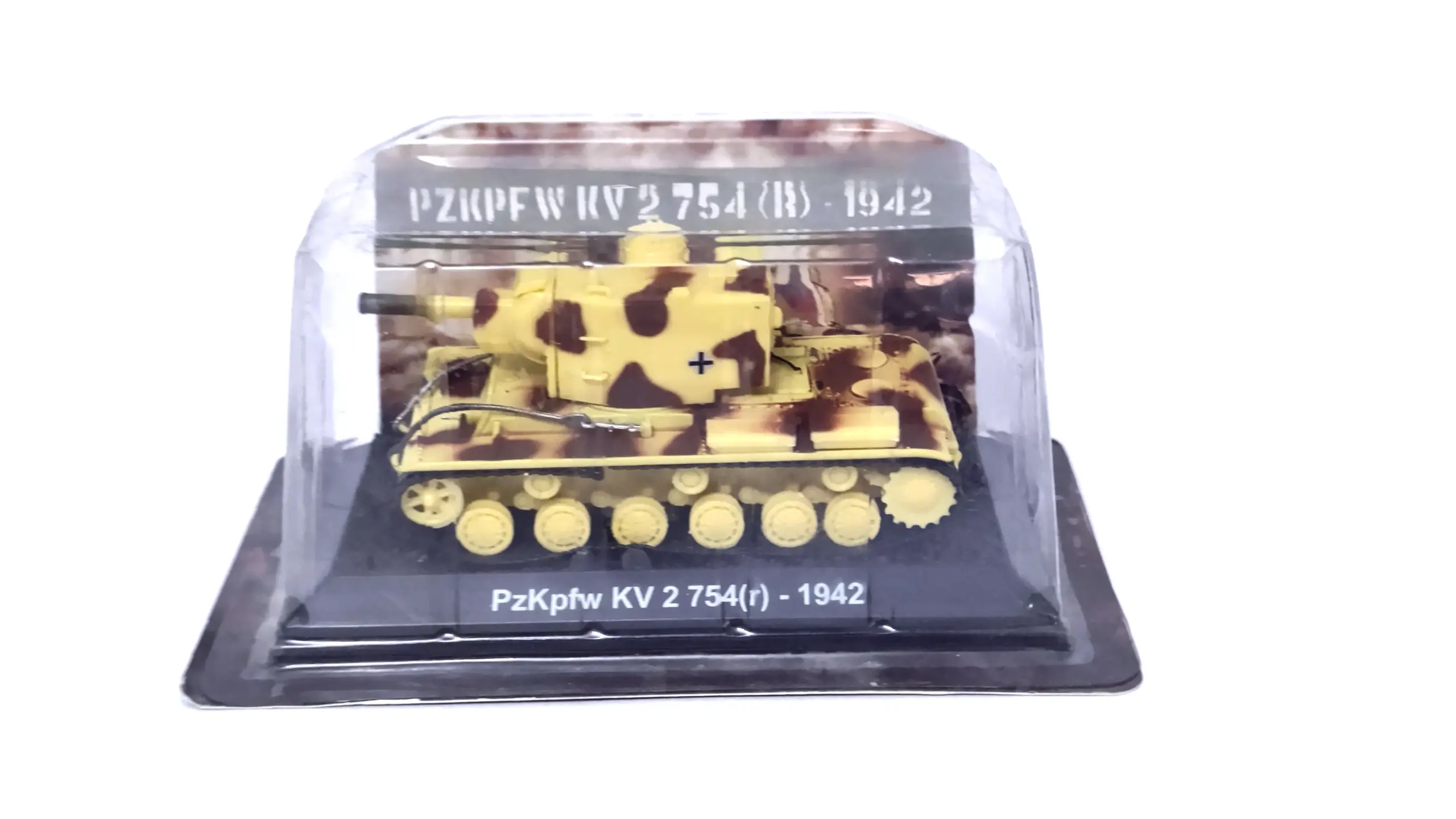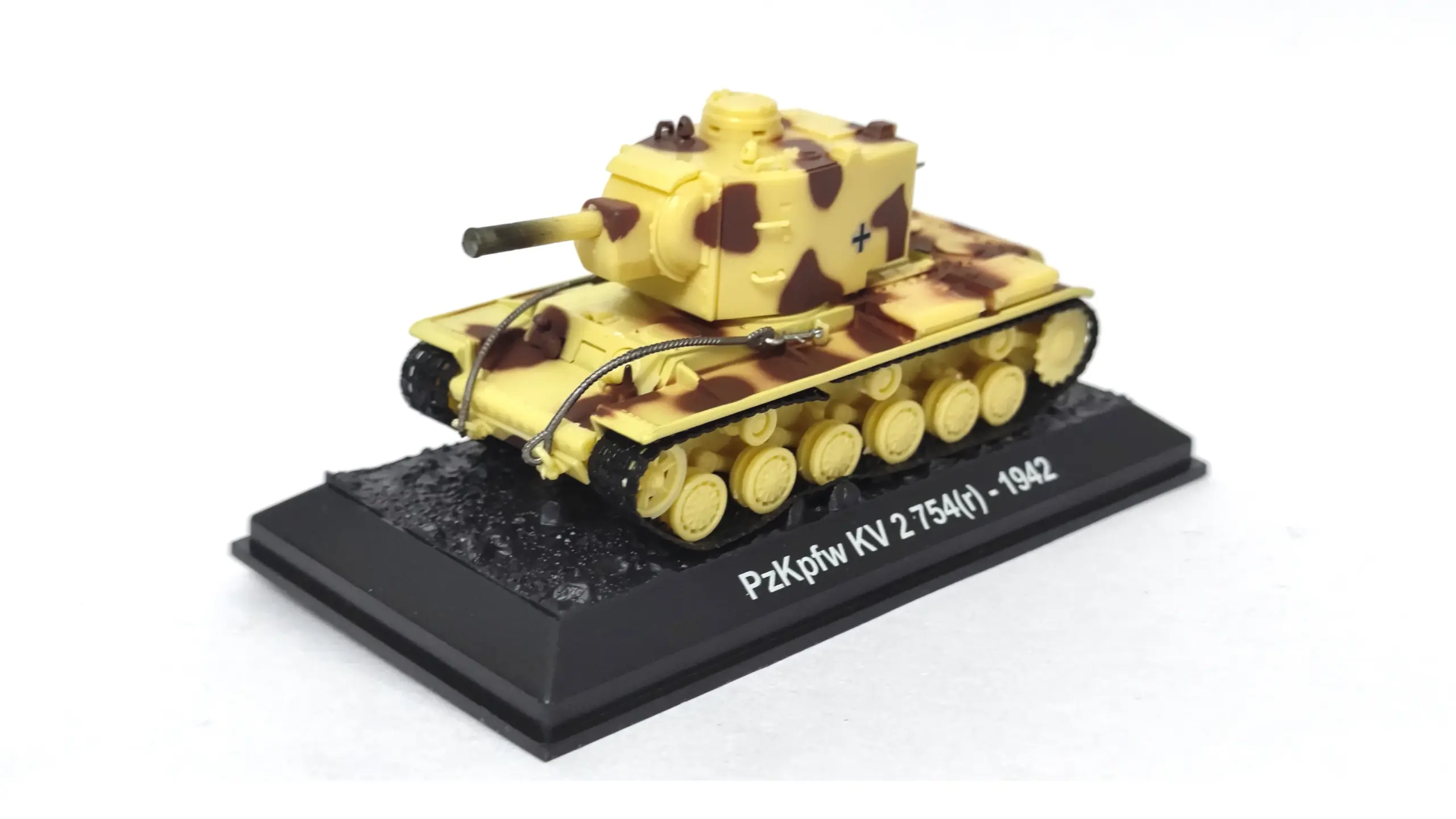 Experience a piece of history with the 1/72 Soviet KV-2 Heavy Tank Model from 1942. Crafted with a semi-alloy construction, this meticulously detailed model features a tan base adorned with a camouflage pattern in shades of brown. The tank measures approximately 9 cm in length, 4.5 cm in width, and 5 cm in height, weighing 0.25 kg. Its barrel extends prominently from the turret, made of durable plastic, while the non-rotating tracks and detailed wheels add realism. Displayed on a sleek black base, this finished piece is perfect for adult collectors and does not require batteries, emphasizing its collectible charm.