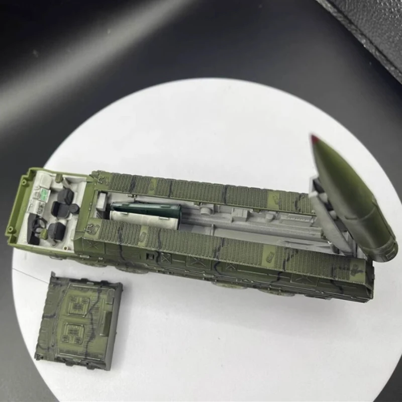 Experience the impressive realism of this meticulously crafted 1/72 scale resin model depicting the SS-23 tactical ballistic missile. Finished with a solid olive green color or striped style, it features intricate panel lines, textured armored plating, and realistic markings that accurately mimic a military vehicle. The angular cab with sloped windshield, tiny rectangular windows, and detailed accessories like windshield wipers and side mirrors add to its authenticity. The slender missile tube tapers to a sharp tip, with fine panel lines and access hatches, standing vertically on the rugged chassis. This high-quality model brings a commanding presence perfect for displays, collections, or static decoration, capturing the rugged essence of military technology with great detail and precision.