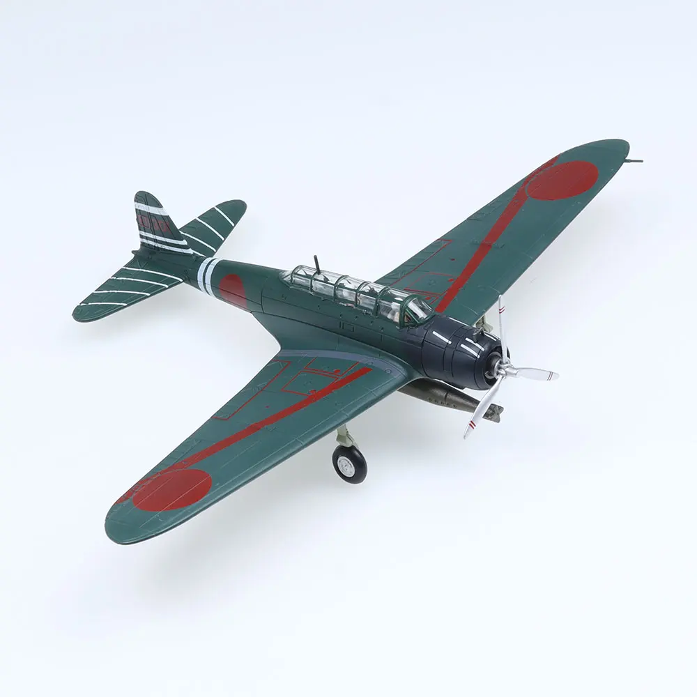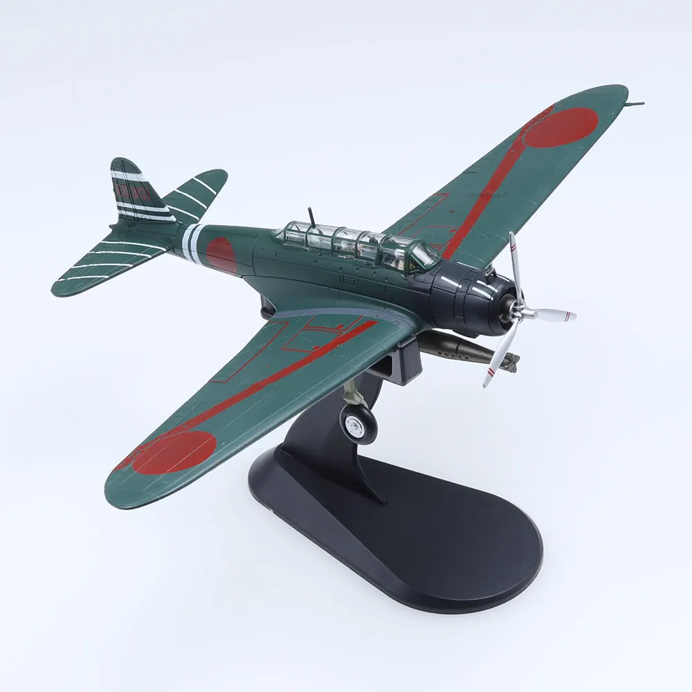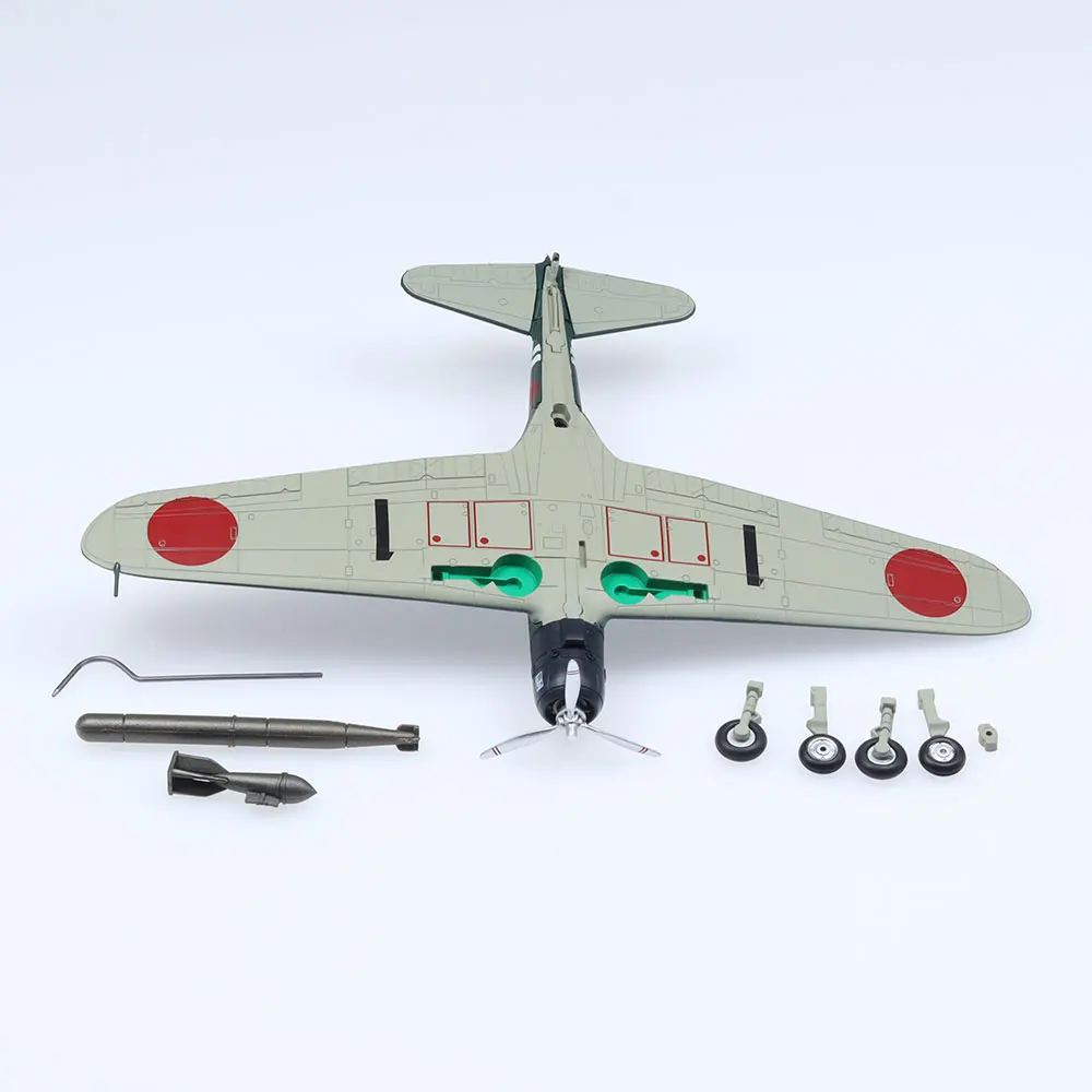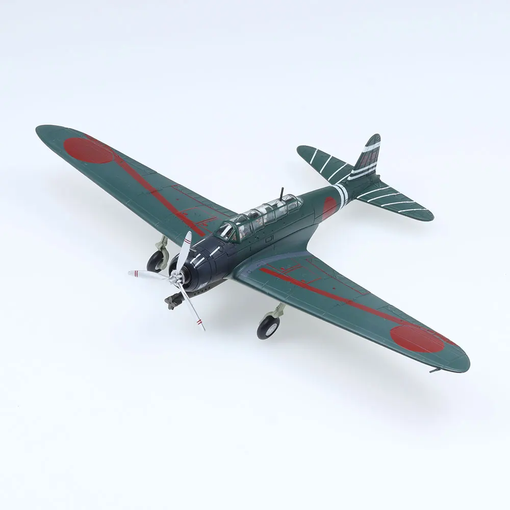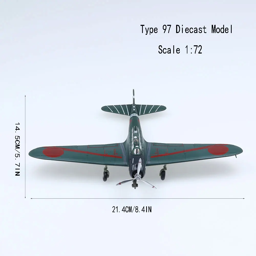 Imagine adding this meticulously crafted Type 97 aircraft model to your collection, bringing a sense of realism and history into your space. Standing about 20 centimeters long with a matching wingspan, this die-cast replica boasts a sleek, metallic dark greenish-gray finish that mimics real metal. The nose is painted matte black, housing a detailed engine and a four-bladed white propeller with red tips, attached to a shimmering silver hub. The broad, tapered wings feature bold red circles near the tips and a sleek red stripe along their length. Its clear cockpit canopy reveals intricate interior details, enhancing its authenticity. Perfect for display during special occasions or as a standout piece in your collection.