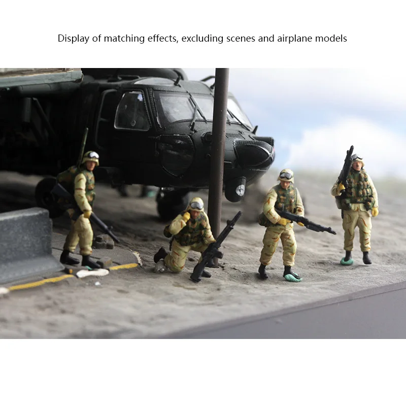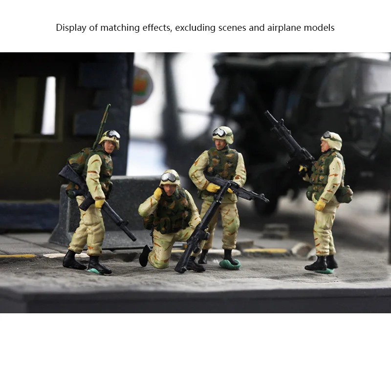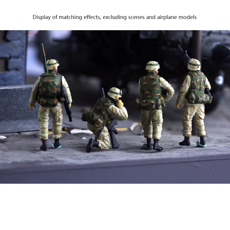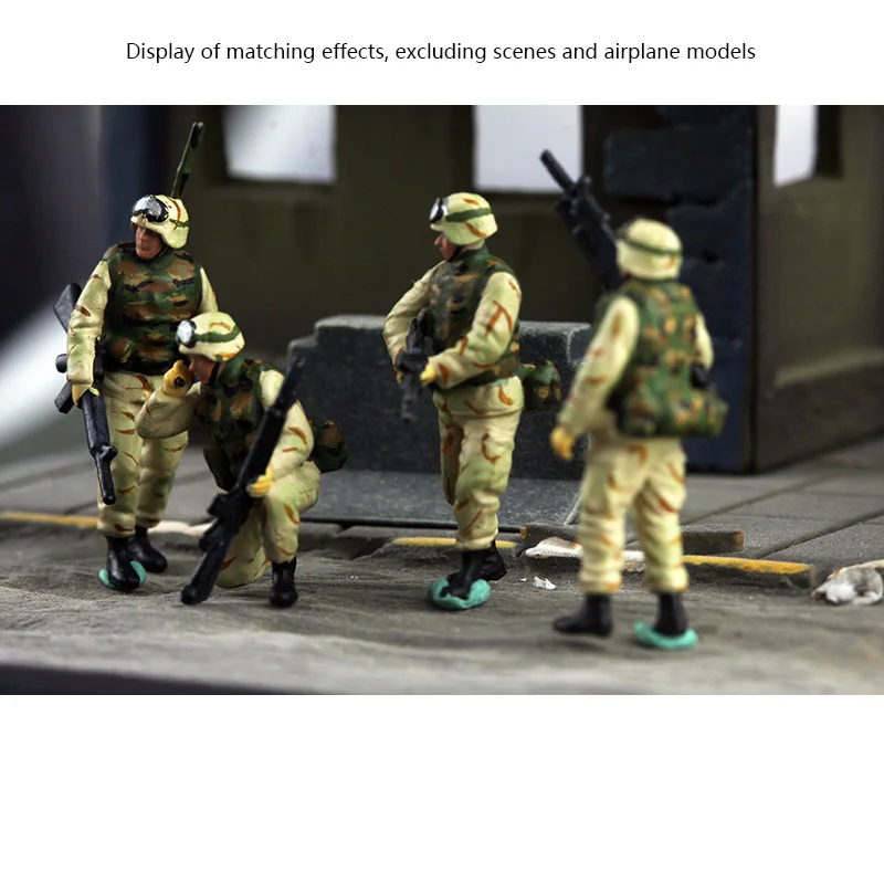 The 1/72 USMC Combat Team Model features an impressive set of four finished soldier figures, each meticulously crafted from high-quality resin. Standing approximately 3 cm tall, these figures showcase detailed facial expressions and lifelike poses, perfect for collectors and military enthusiasts alike. Dressed in light-colored combat uniforms with possible camouflage patterns, the soldiers represent dynamic action, whether standing with rifles, kneeling, or engaged in combat stances. Their polished paint finish in shades of green, beige, and black adds to the authenticity, making them an exceptional addition to any military model display. This model set is designed specifically for enhancing military sand table scenarios, allowing you to create immersive dioramas.