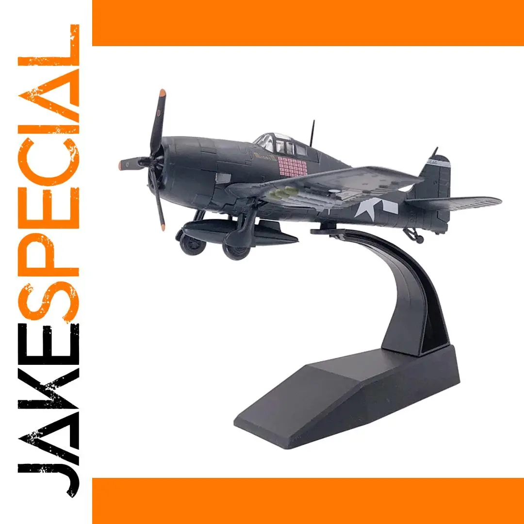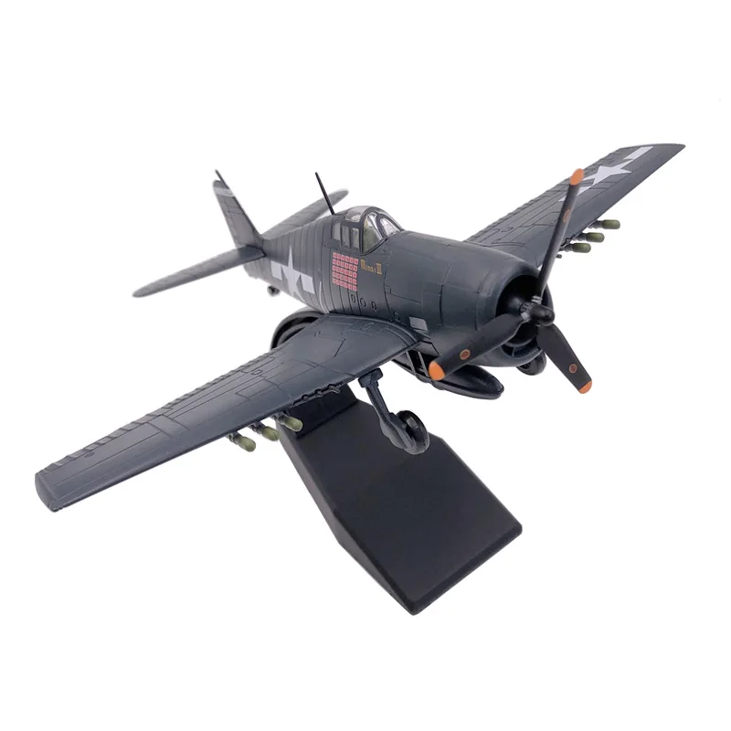 Step into history with this meticulously crafted 1/72 scale WWII US F6F Hellcat fighter aircraft model. Crafted from high-quality alloy and engineering plastic, this diecast replica captures the sleek, streamlined fuselage painted in military dark gray or navy blue, reminiscent of vintage fighter planes. Every surface showcases fine panel lines, surface textures, and authentic markings like white star insignia with a blue circle, evoking wartime aircraft details. The transparent cockpit canopy features internal framing, enhancing realism. Its rounded nose houses a detailed four-bladed propeller with bright orange or red tips for visibility. The extended landing gear with textured tires and precise struts adds operational authenticity. Perfectly balanced on its display stand, this model is a striking addition to any collection or display space.