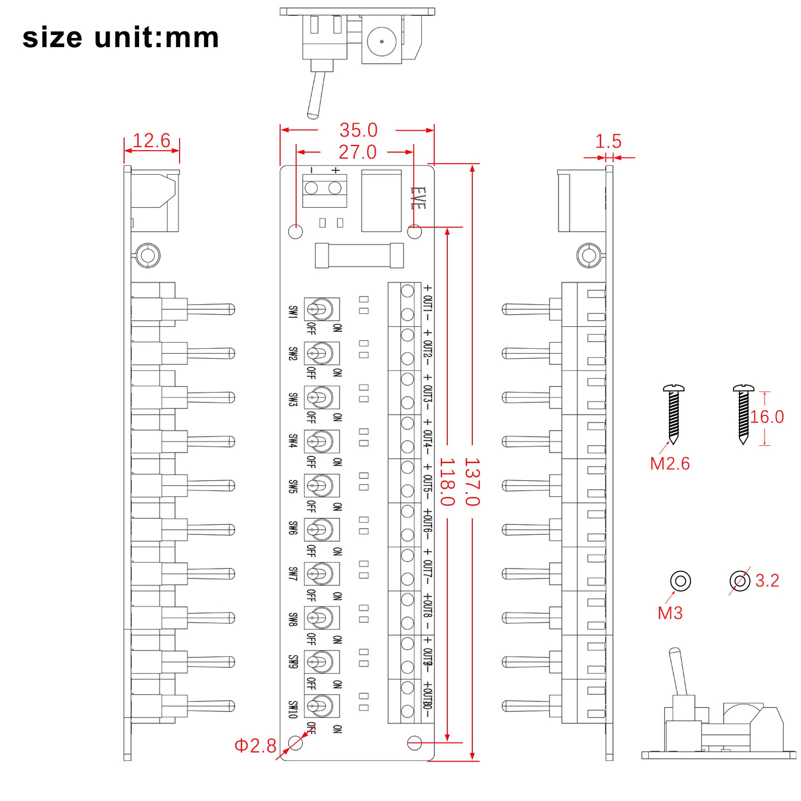 - Neatly aligned metallic screw terminals in a single row with toggle switches marked “ON” and “OFF,” combined with LED indicators for quick status checks at a glance.