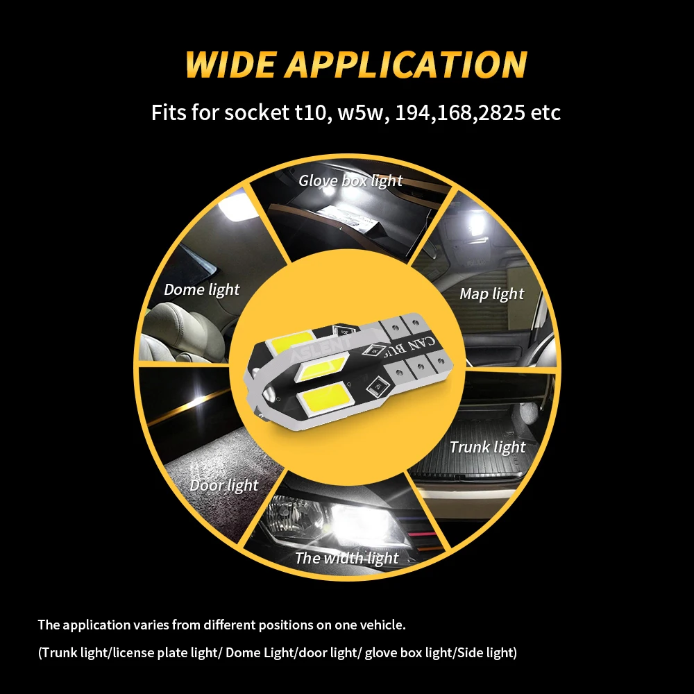 Upgrade your vehicle’s interior and exterior lighting with this set of 10 high-performance T10 W5W/194 LED bulbs, each operating at 12V and consuming only 1.2W while emitting a bright 600 lumens. Featuring 5630-8SMD LEDs housed in a sleek, compact design with aviation-grade 6063 aluminum for optimal heat dissipation, these waterproof (IP67) bulbs are built to last approximately 80,000 hours. Available in vibrant colors such as 6000K White, Amber Yellow, Blue, Green, Ice Blue, Pink/Purple, Red, and Warm White, they are perfect for license plates, dashboards, interior lights, and more, delivering reliable and stylish illumination for countless automotive applications.