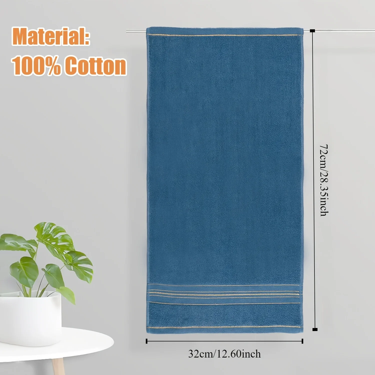 Experience the luxurious comfort of this high-quality 100% cotton bath towel, crafted for those who value softness and durability. Measuring 32 x 72 cm, it offers a perfect size for daily use, fitting comfortably in your hand or for quick drying. The towel features a plain woven design with three thin horizontal gold stripes adding a subtle touch of elegance. Available in versatile shades of beige, calming blue, and dark gray, it seamlessly complements any bathroom decor. Its plush terry fabric texture provides excellent absorbency, drying you in just 15-20 seconds. Light, quick-drying, and machine washable, this towel combines practicality with refined aesthetics for a premium experience every day.