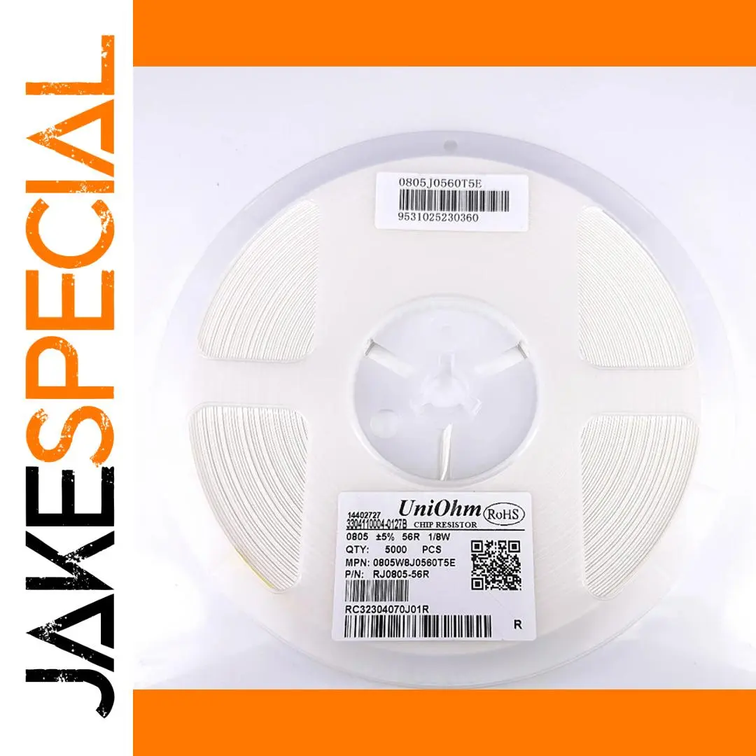 - Technical specifications include resistance value of 56Ω, tolerance of ±5%, power rating of 1/8W, temperature coefficient of ±100ppm/°C, and surface-mount 0805 size.