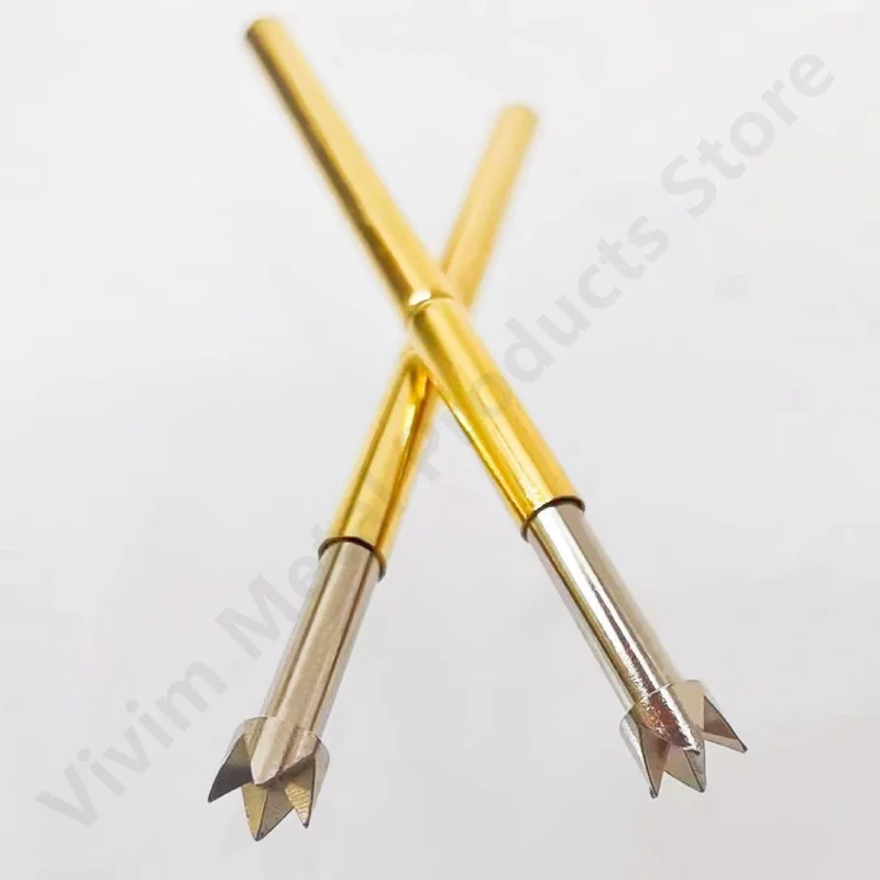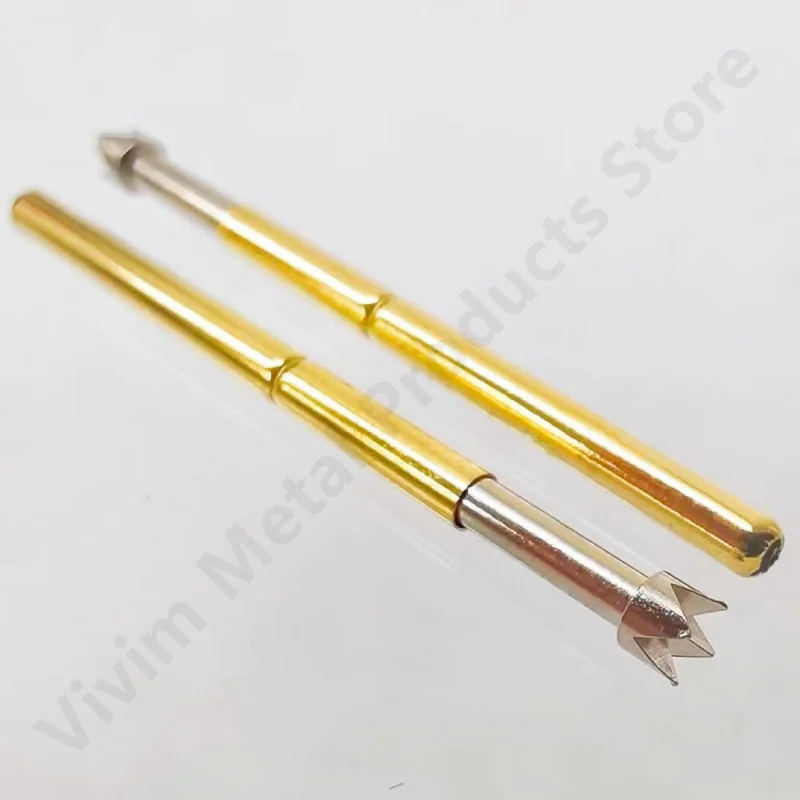 Experience reliable electrical testing with this set of 100 high-quality spring test probes, also known as pogo pins. Crafted from phosphor brass, these probes feature a sleek, metallic design with pointed, star-shaped tips that ensure a secure and durable connection during circuit board tests. Each probe measures approximately 33.35mm in length, with a pin diameter of about 2.02mm and a head diameter of approximately 2.5mm. The gold-colored finish on the shanks not only enhances aesthetic appeal but also provides superior conductivity and corrosion resistance. Designed for precision and repeated use, these probes are ideal for PCB diagnostics, electronic component testing, and circuit board service applications. Their compression load style heads guarantee stable contact during testing procedures, ensuring accuracy and longevity.
