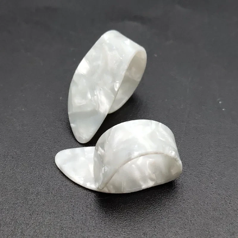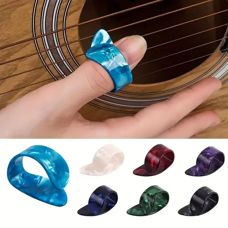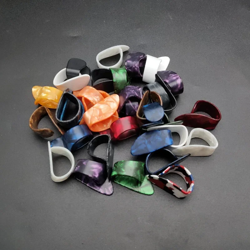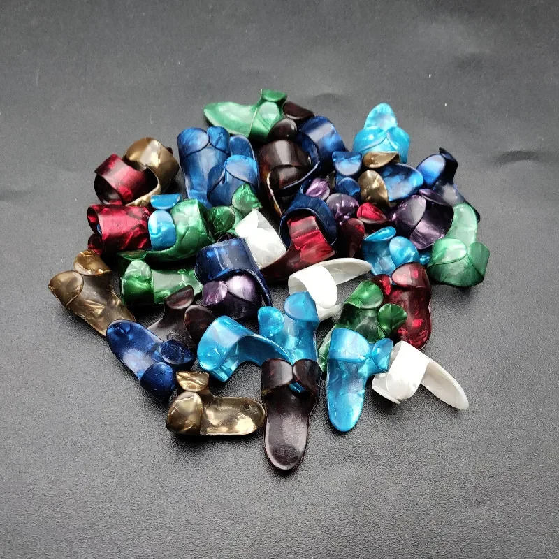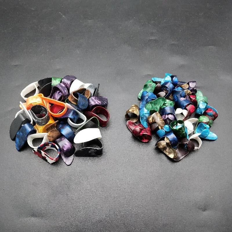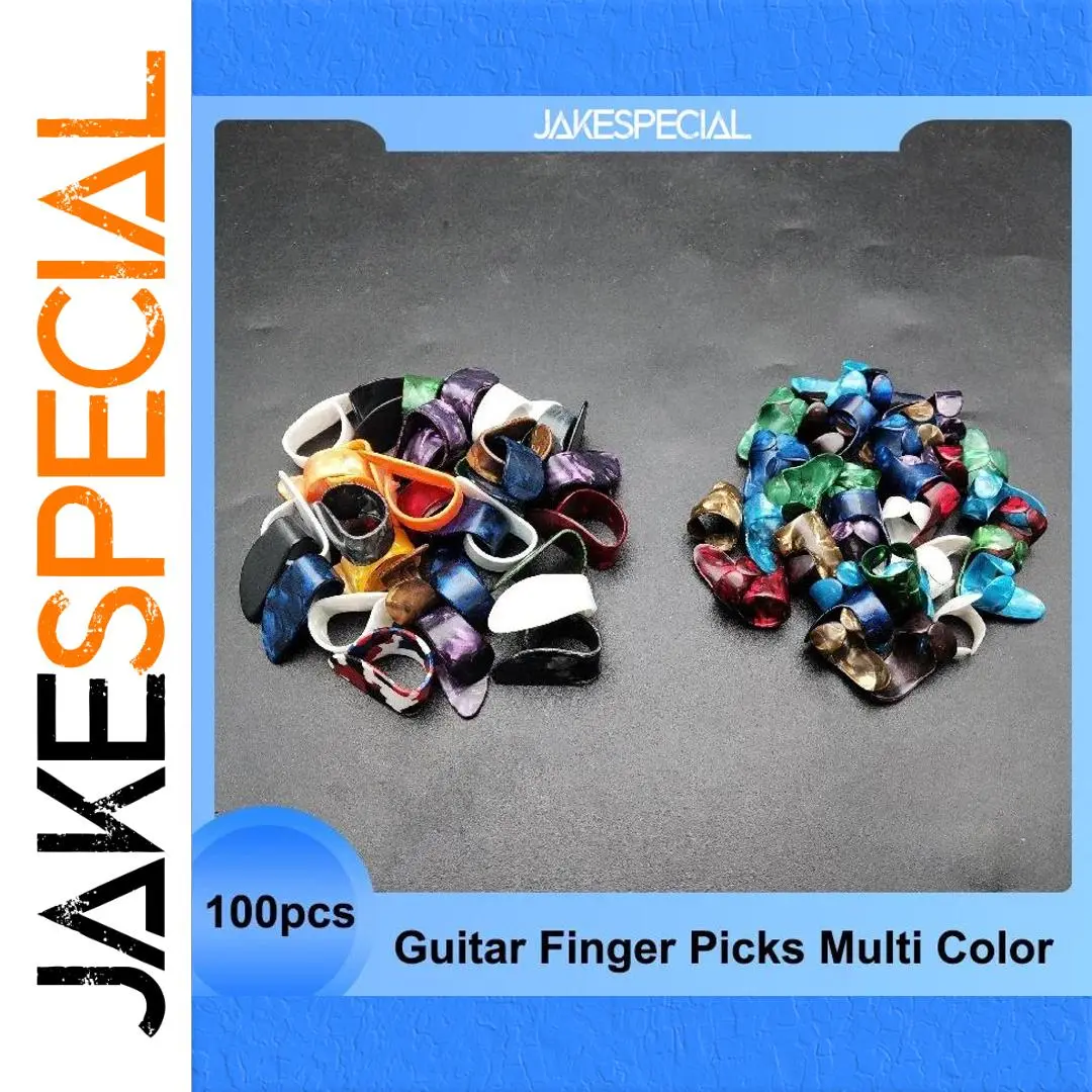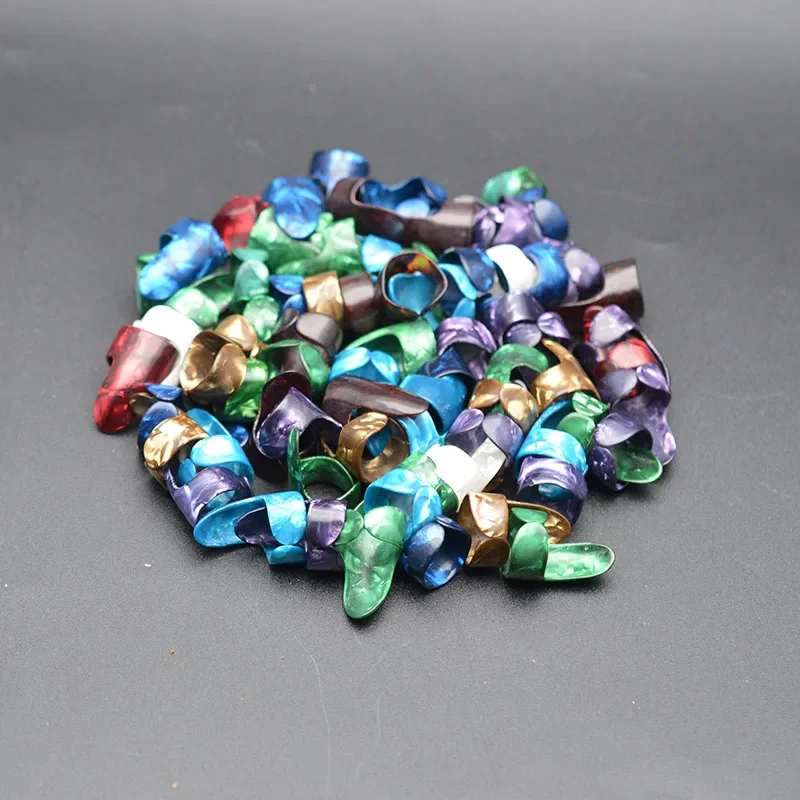 Enhance your guitar playing experience with this set of 100 multi-color acoustic and electric guitar finger picks, crafted from durable celluloid material. Each pick, featuring a thickness of approximately 1.3mm, is expertly designed for comfortable use with both thumb and forefinger, ideal for acoustic guitar fingerpicking styles and versatile enough for other instruments. The vibrant pearloid finishes in shades of blue, green, red, brown, black, and white create a striking visual assortment, inviting you to explore various tones and techniques. This collection ensures you have the perfect pick at hand for every performance.