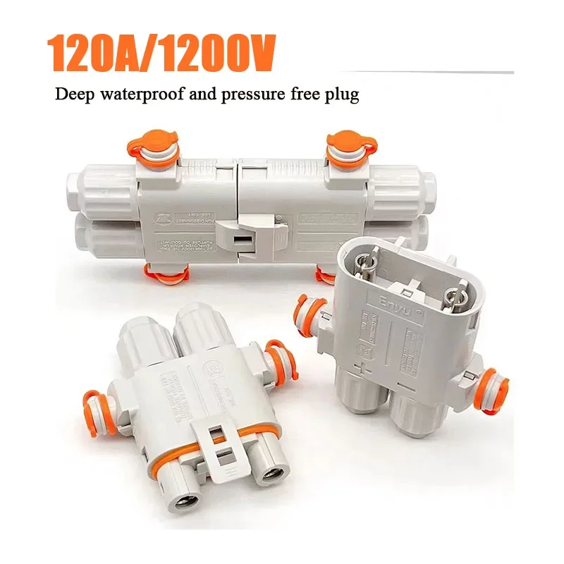 Experience reliable power connections with this waterproof 100A connector, designed for high-voltage applications up to 1200V. Crafted from durable white plastic, it offers a sleek yet rugged look, ideal for outdoor environments like truck parking, air conditioning units, electric forklifts, and generators. The male and female components are precisely molded to ensure a secure fit, with prominent orange rubber seals around connection points that provide excellent waterproofing. The connectors feature locking mechanisms and pressure-resistant sealing rings, ensuring safety and stability during operation. Equipped with thick cables—red for power and black for ground—this assembly guarantees efficient and safe power transfer, even in harsh conditions. Its modern industrial design combines functionality with durability to serve a wide range of demanding applications.